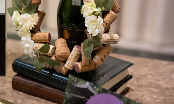 ワインボトルを飾ったり、ペーパーアイテムにグラスのデザインを入れたり、席札やリースはコルクを使って手作りしました!カラーもシャンパンゴールド&ワインレッドを意識して取り入れることで、より『ワイン』を連想させる空間になったと思います。