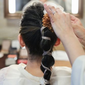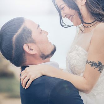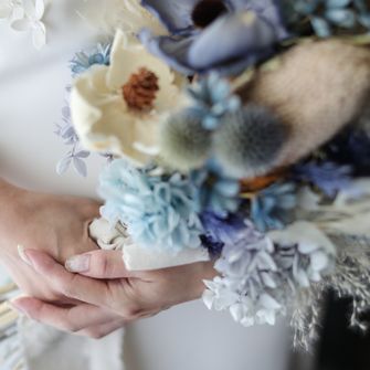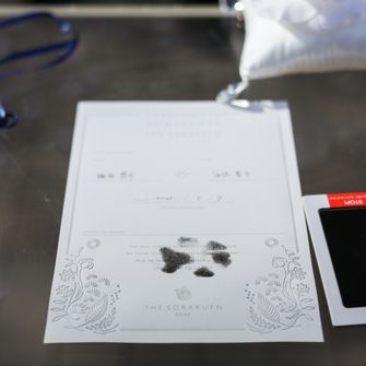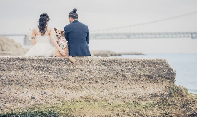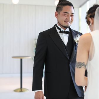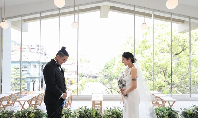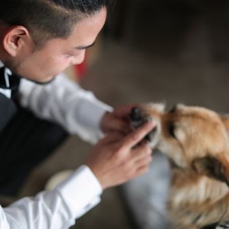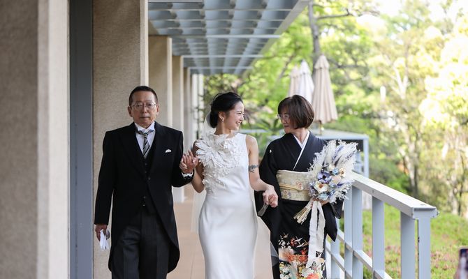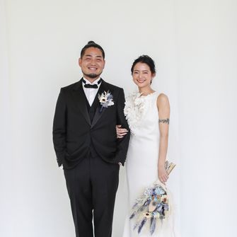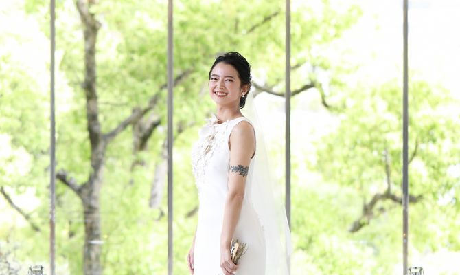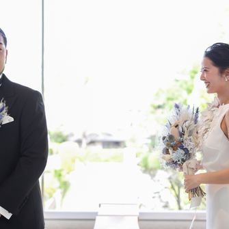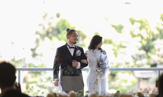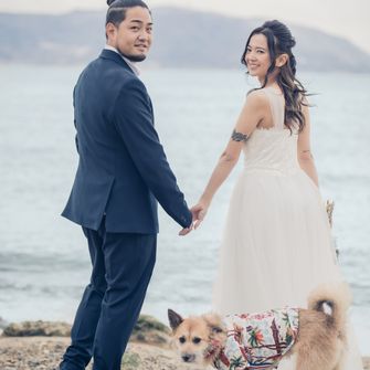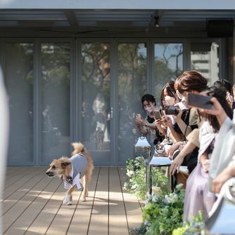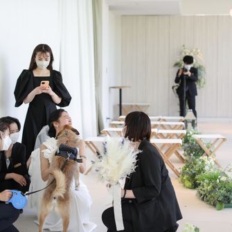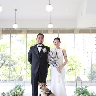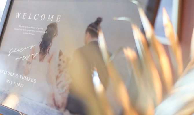 テーマは"ナチュラルでアットホームな結婚式"です。式場を決める際に決め手となったポイントは、わんちゃんがOKなところと、ガーデンで100人以上の挙式ができるところでした。