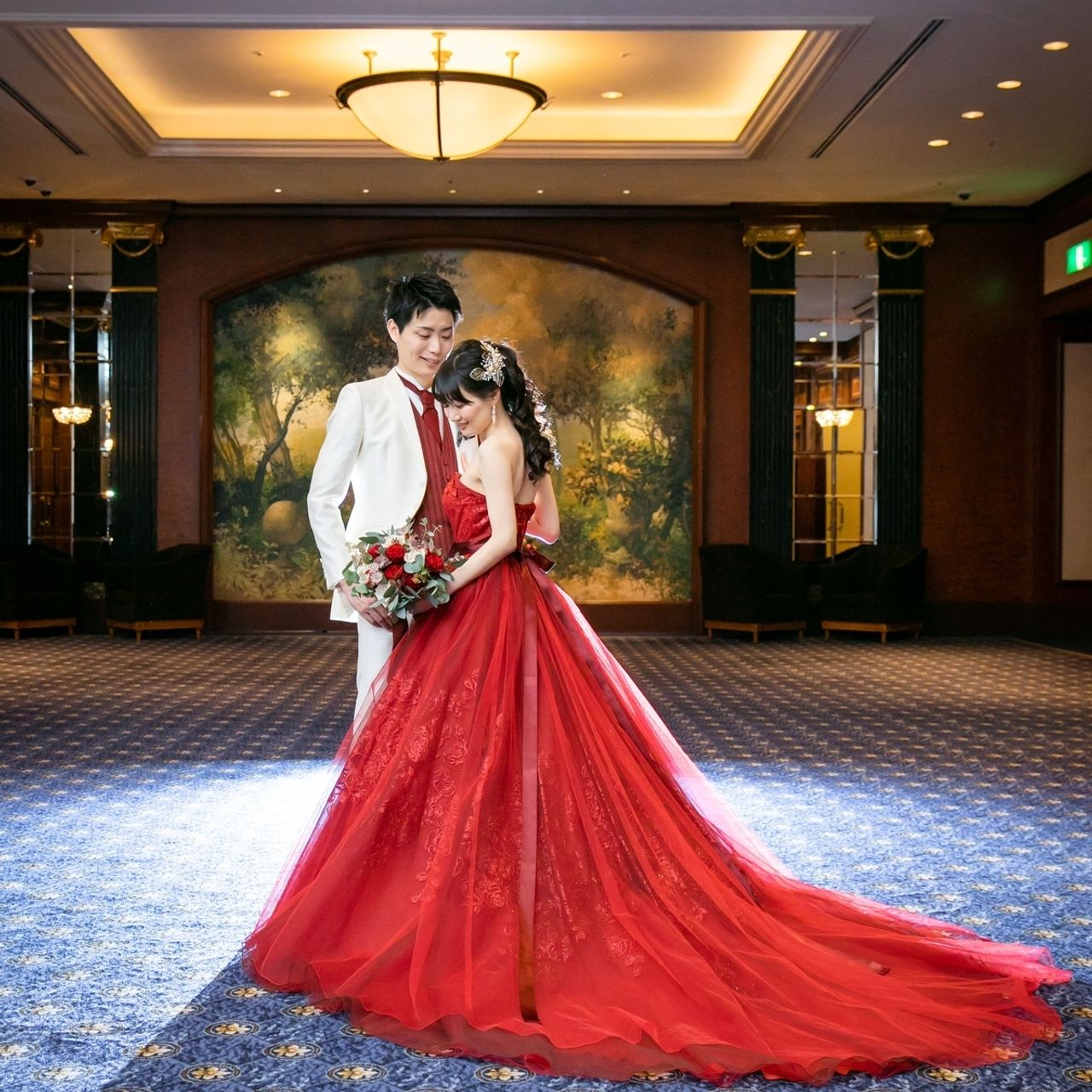 お色直しでは赤いドレスに合うBride meの金色のヘッドアクセサリーをつけています。