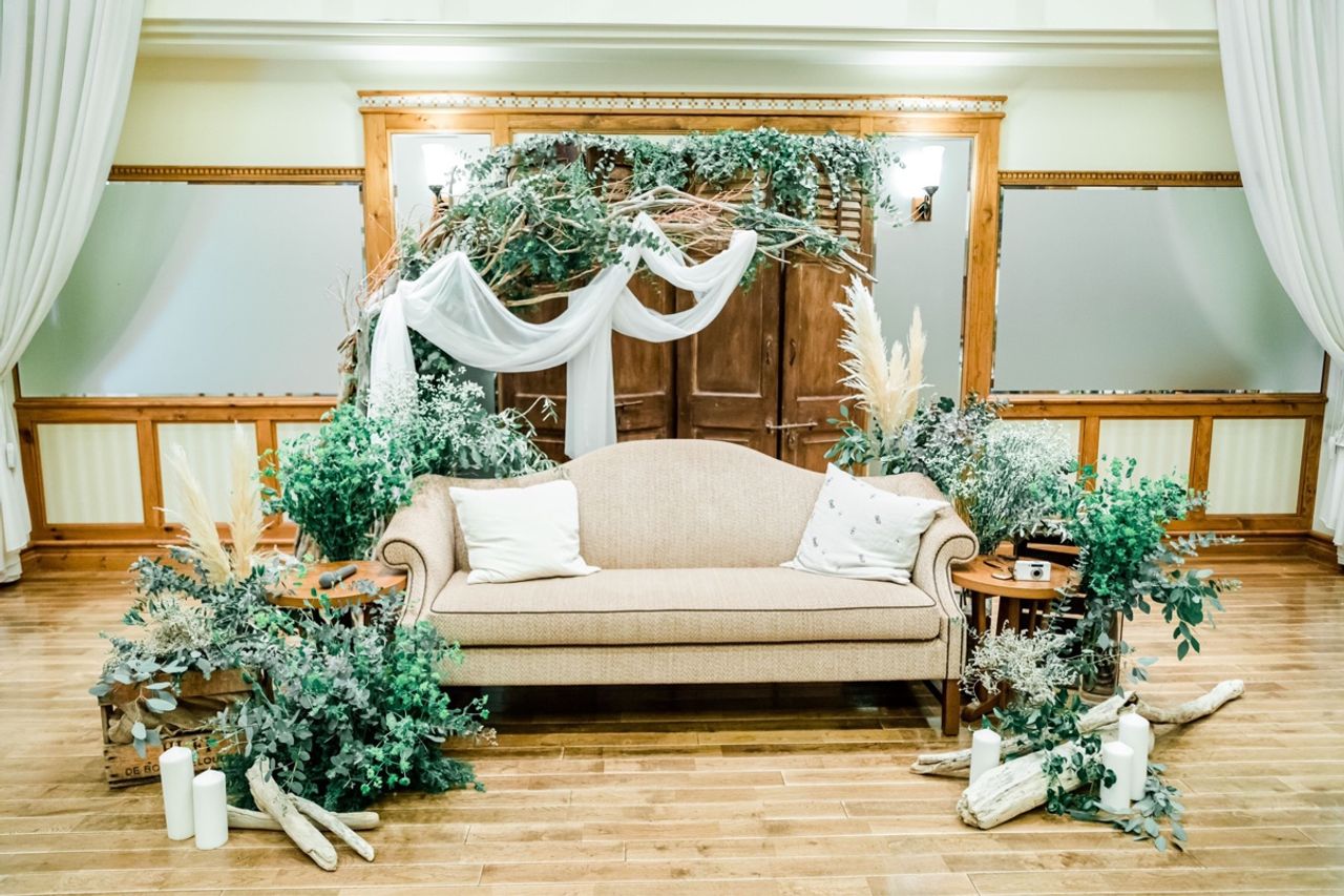 木目調の内装やガーデンの雰囲気に合うよう、グリーンをベースに大好きなパンパスグラスを足しながらナチュラルなテイストに仕上げてもらいました。