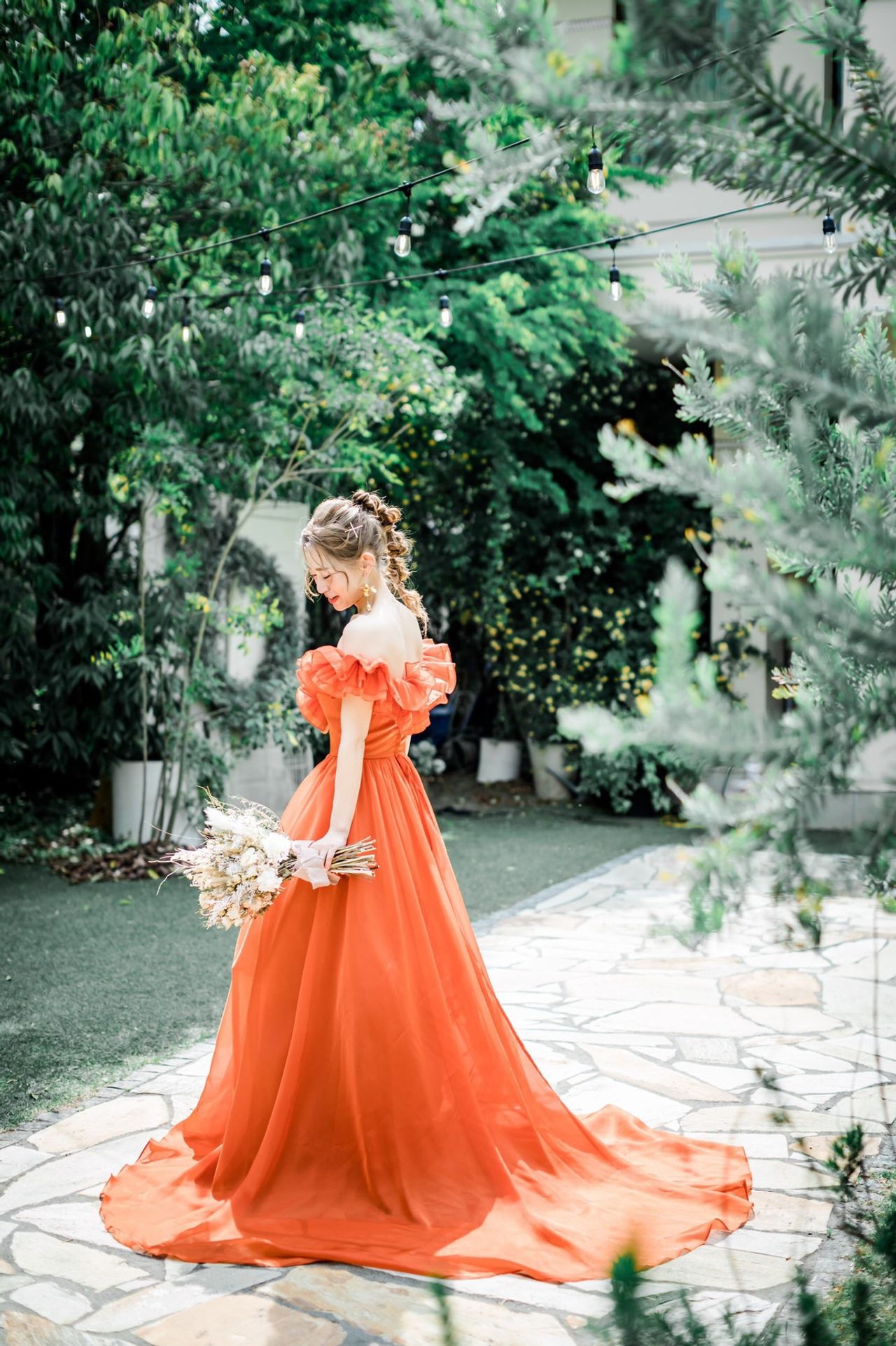 ヘアについては、外国の方のようなカジュアルな抜け感を演出するために、ヘアカラーはハイトーンに仕上げ、ゆるっと動きのあるヘアセットにしてもらいました。特に評判が良かったのは、カラードレスの際の高めの位置から結った玉ネギヘア。オレンジのドレス、ハイトーンヘアとの相性が抜群に良かったです。