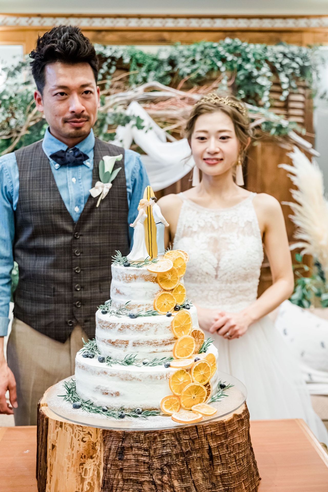 旦那さんの大好きなサーフィンをモチーフにしたケーキトッパーに、波に見立てたオレンジのドライフルーツを上から下へ流すように飾り仕上げてもらいました。