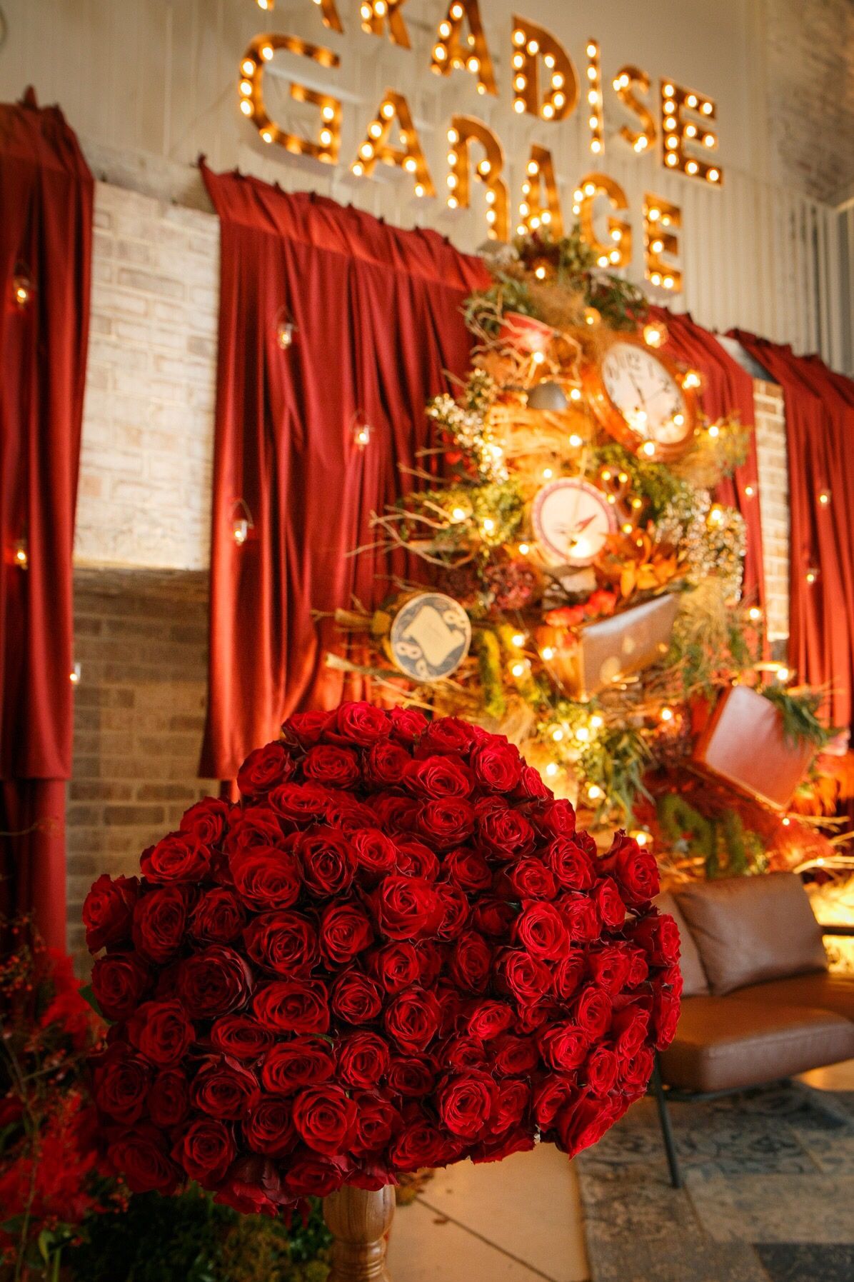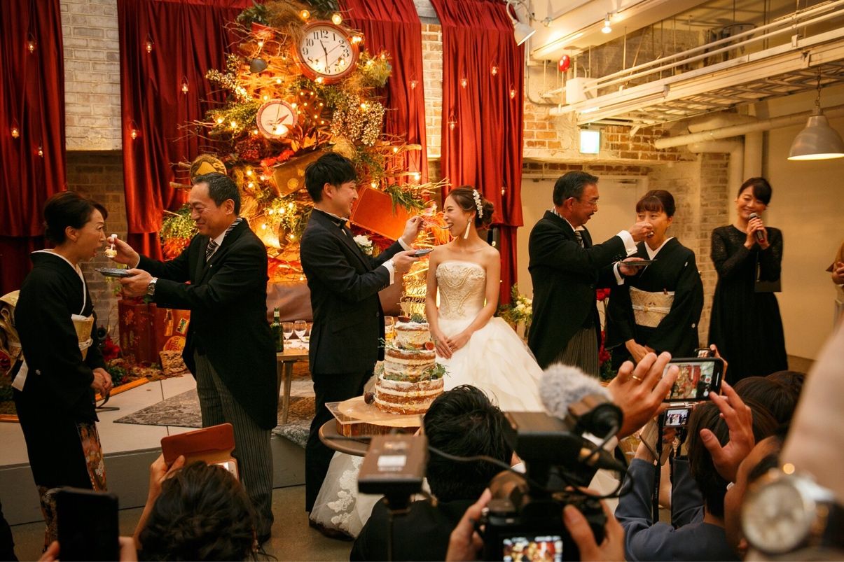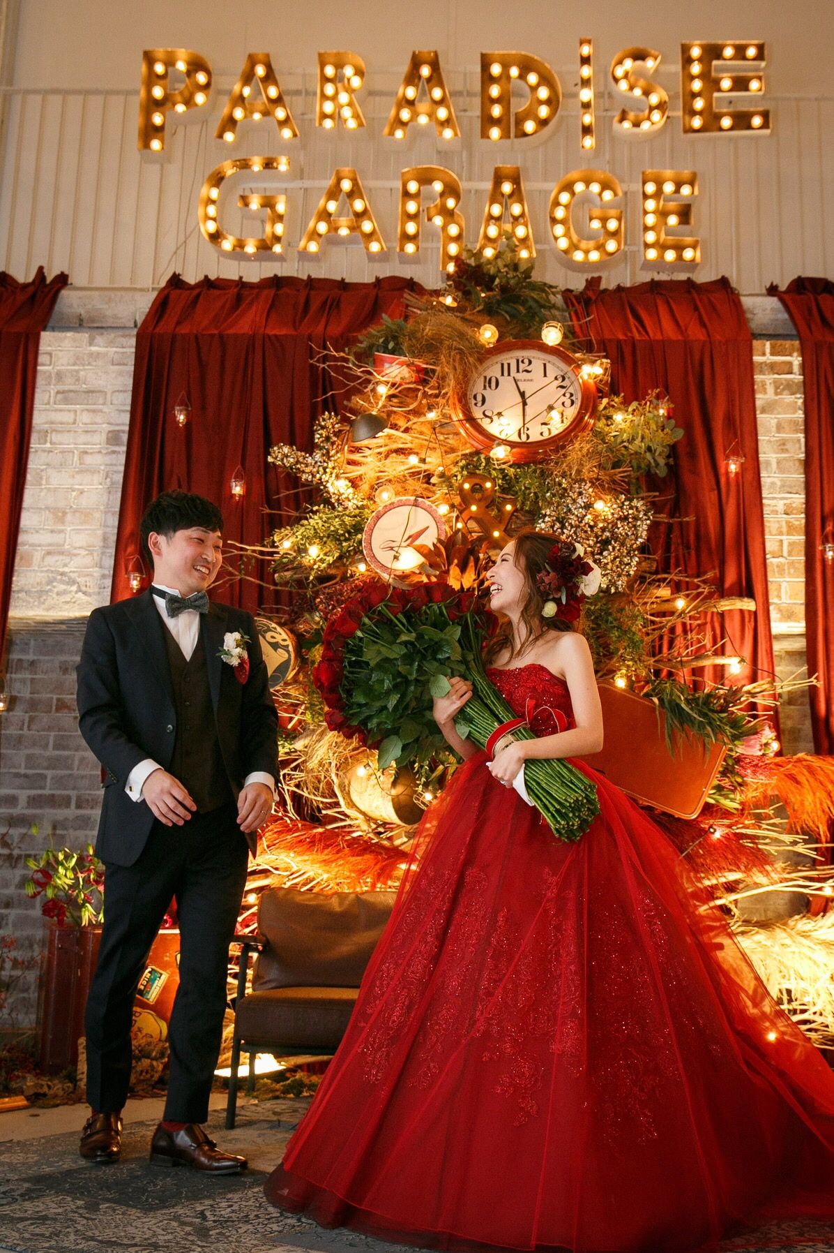 テーマカラーのレッドを主体にクリスマス要素を取り入れたインパクトのある高砂をつくっていただきました。演出もたくさん入れてエンターテイメント性を重視しました!