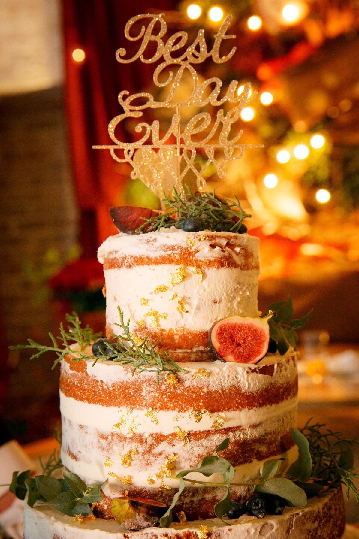 テーマカラーであるゴールドを取り入れたく、金箔をあしらっていただきました。ネイキッドケーキは仕上がりが少し硬めになるということで、取り分けはなしにしました。