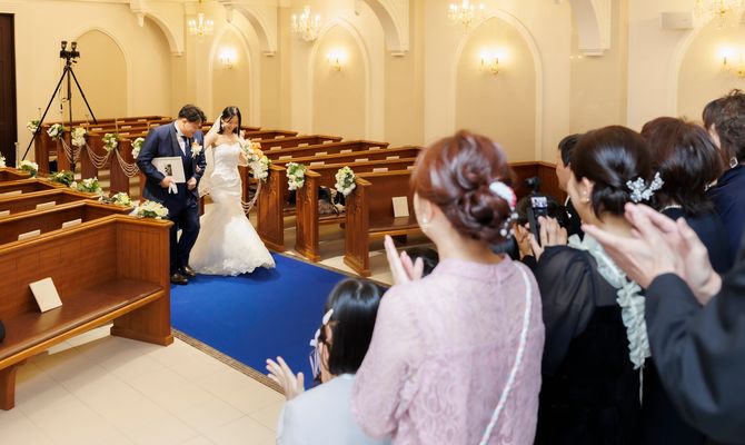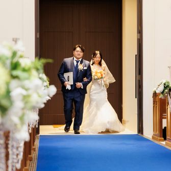 式場はチャペルの青いバージンロードが決め手となり選びました。実際に迎えた当日も、想像していた以上の空間でした。