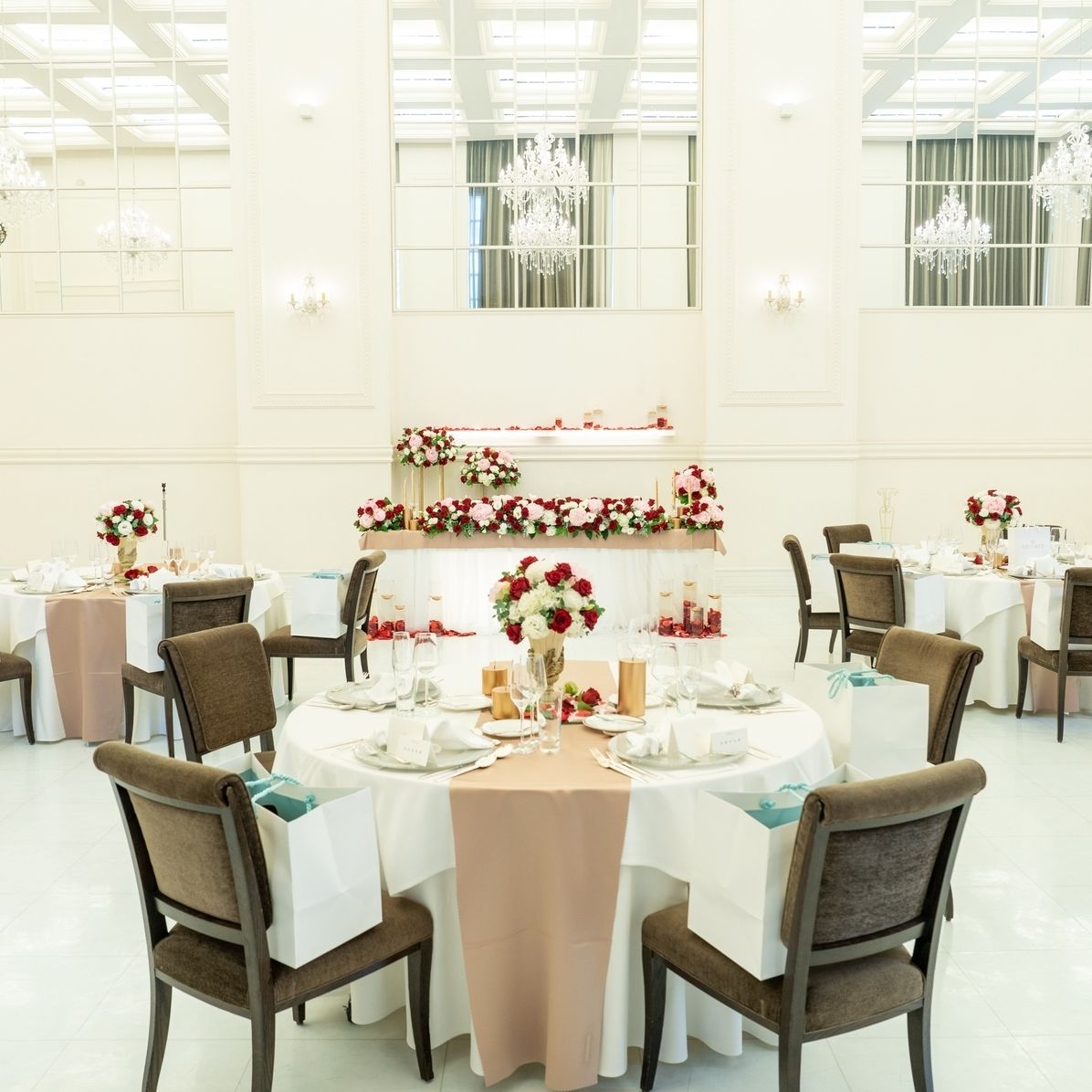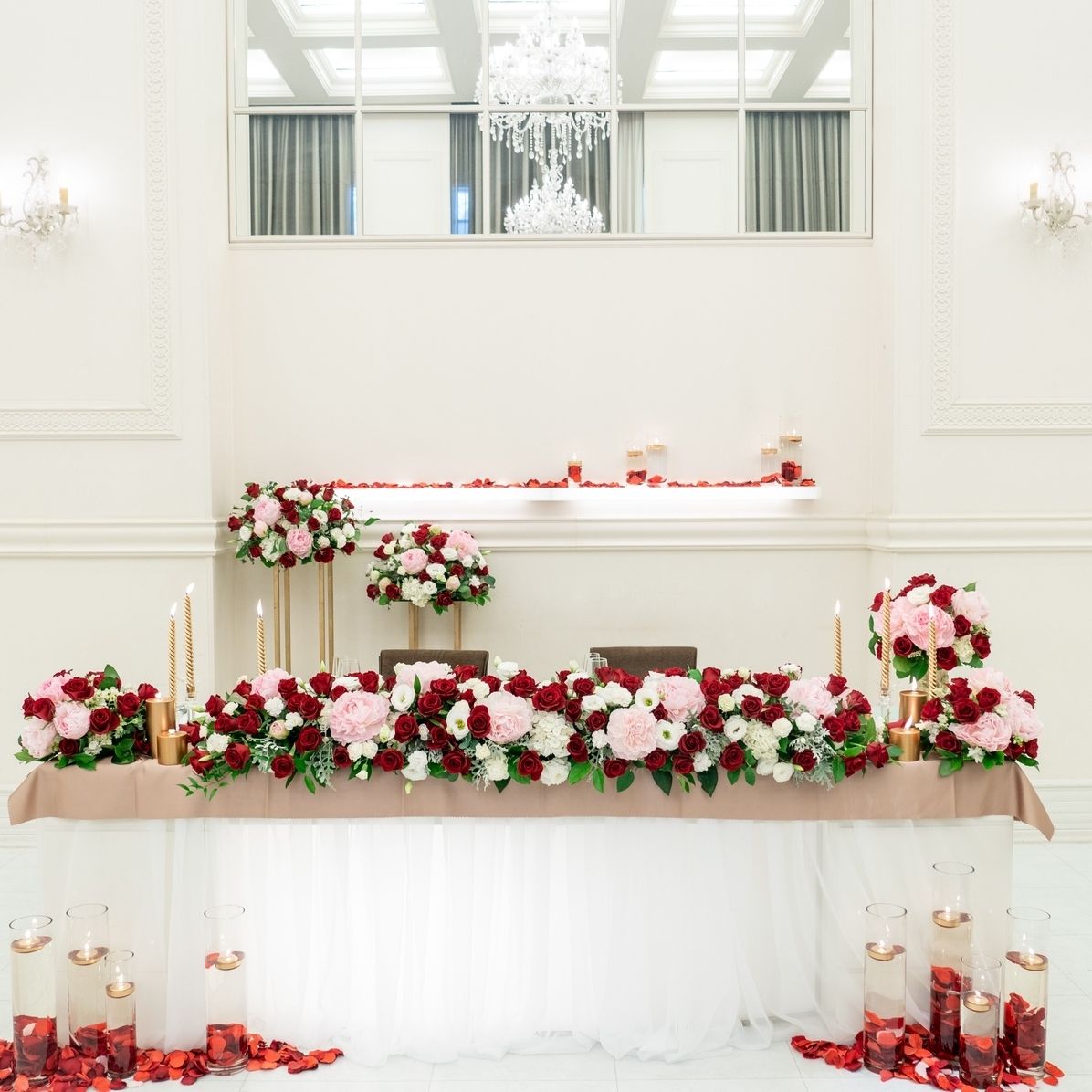会場装花は赤、白、ピンクに統一し、バラや季節のお花のトルコキキョウを使用しました。ゴールドの棒キャンドルなど、キャンドルは特にこだわりです。