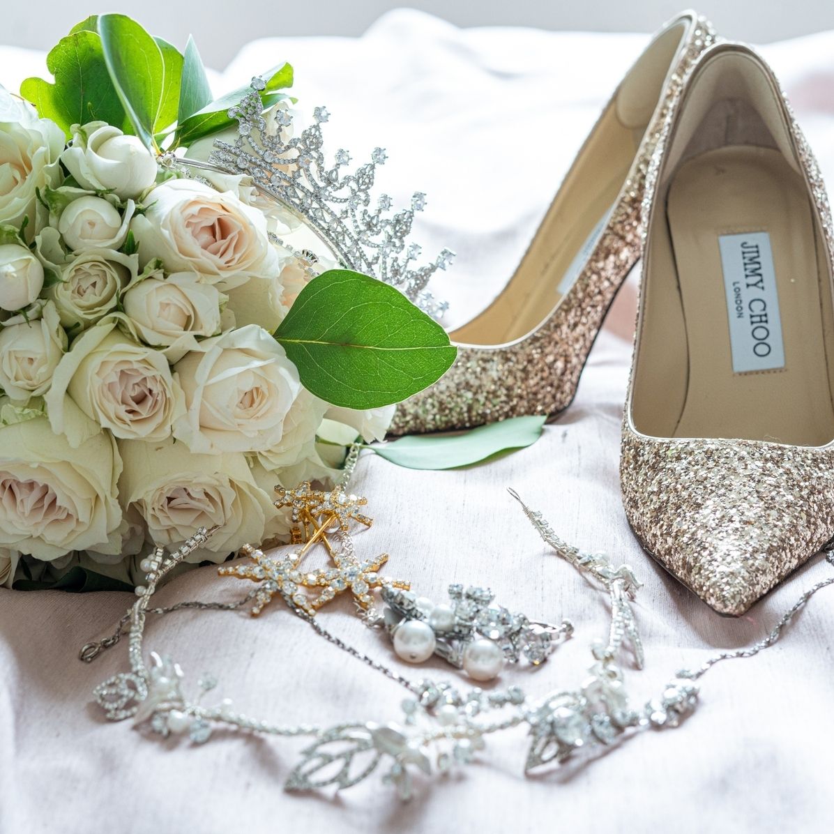 カラードレスの際は10cmヒールのJIMMY CHOO グリッターパンプスです。