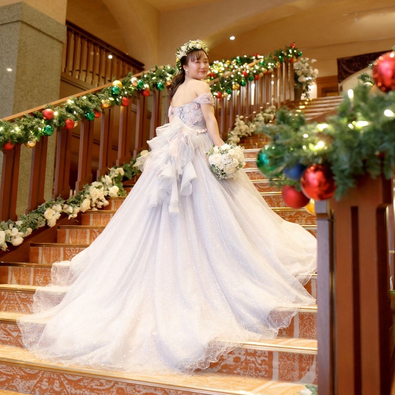 シンプルなデザインですが、キラキラとした装飾が施されており、チャペルの光に照らされるとまるで"プリンセス"のようです。トレーンも長く、ロビー階段での撮影にぴったりでした。