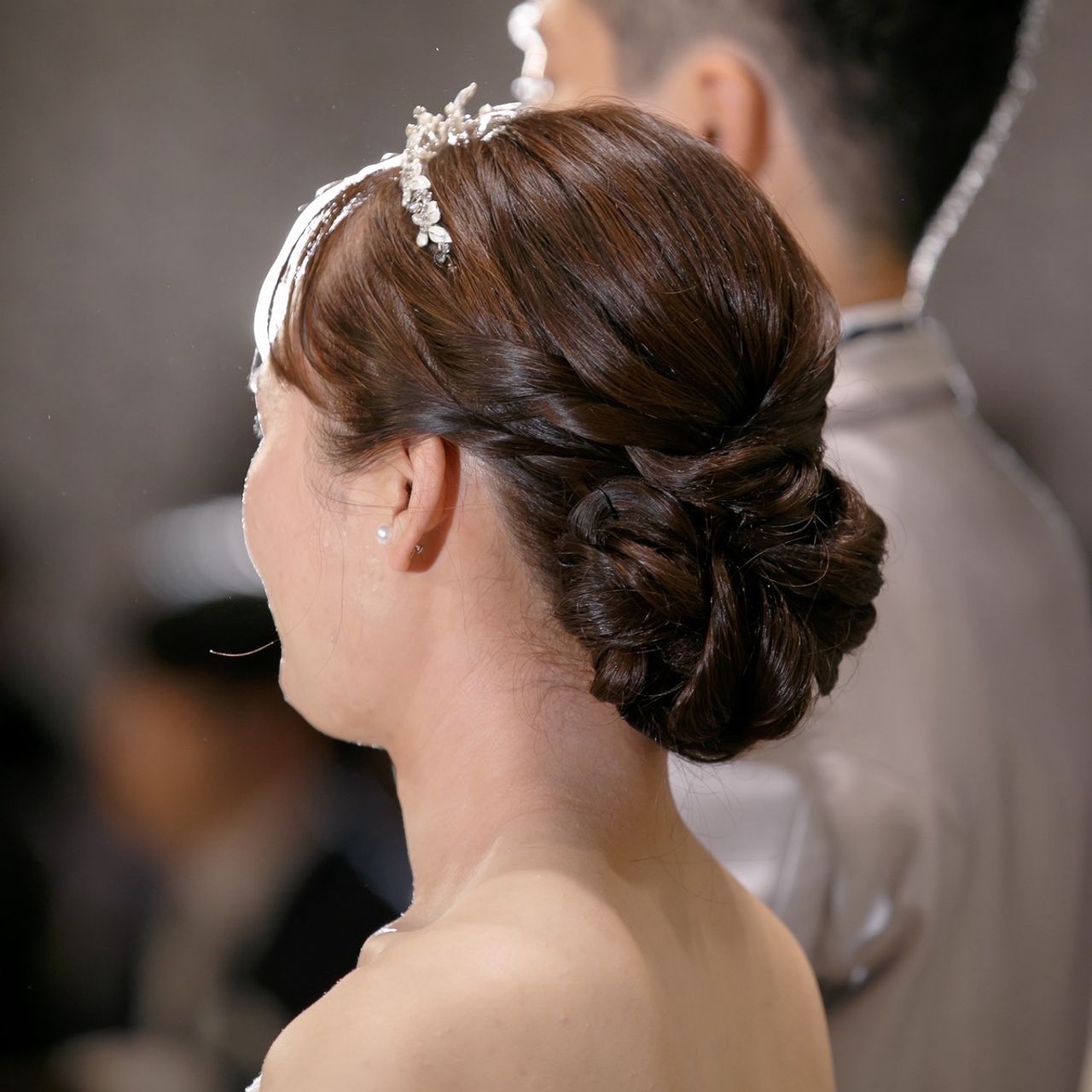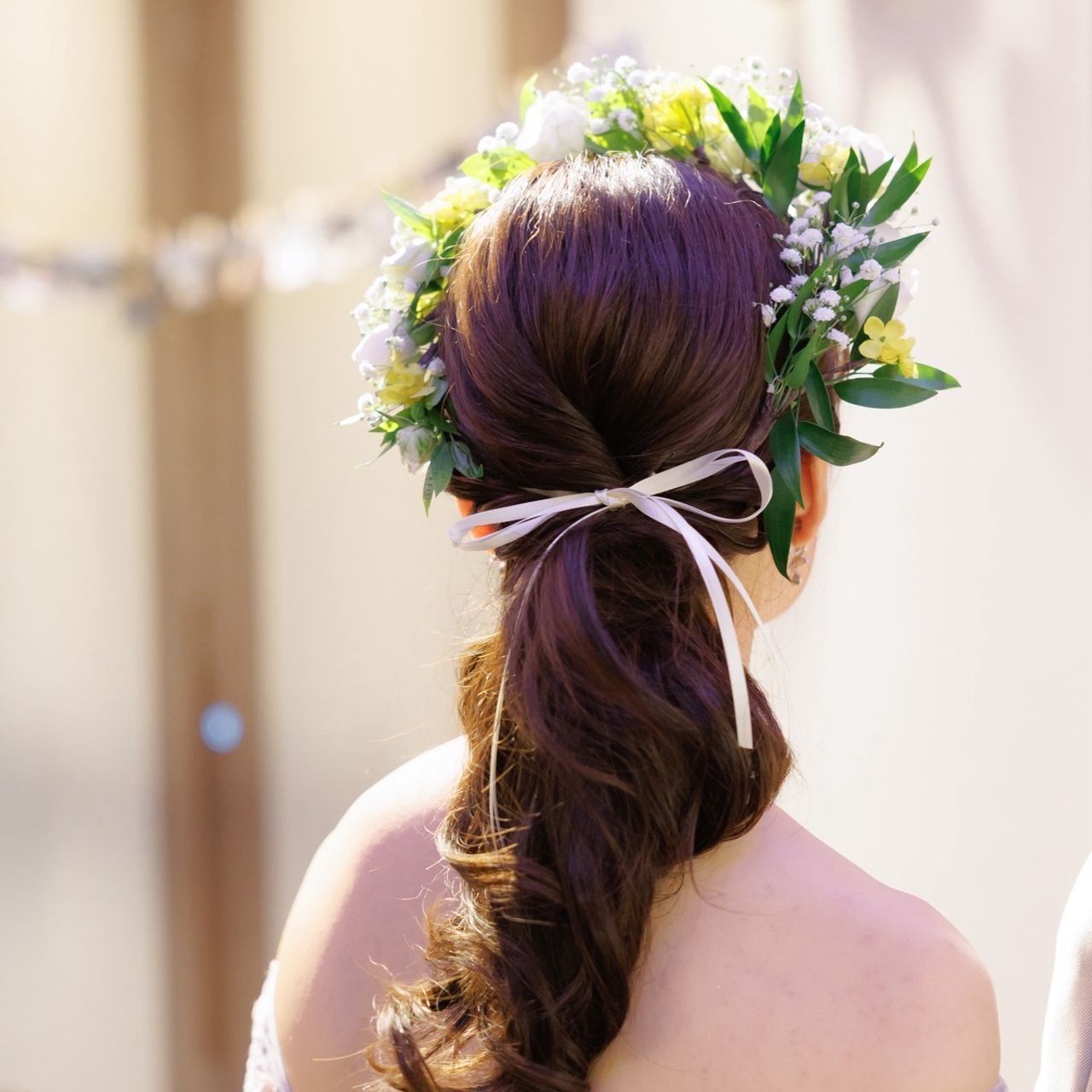 ウェディングドレスではシニヨン、カラードレスでは花冠が似合うよう、ローポニーに仕上げてもらっています。