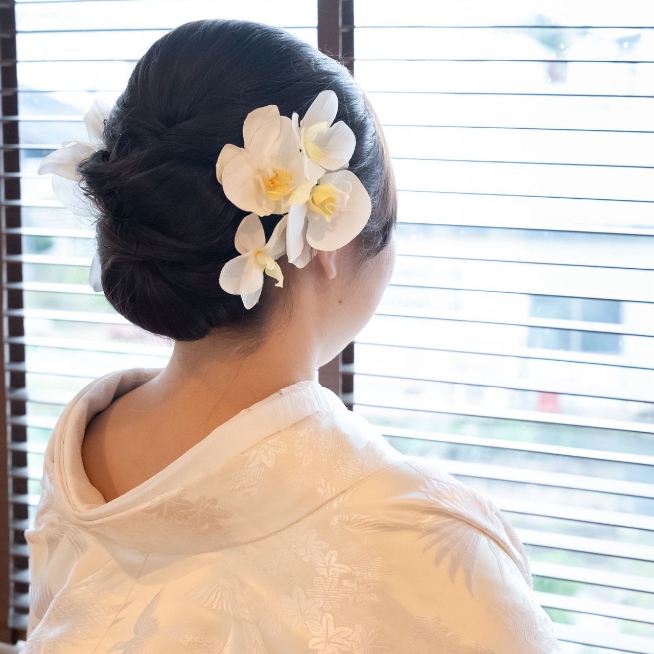 白無垢では胡蝶蘭を、色打掛では胡蝶蘭と水引を、ドレスでは造花をつけました。