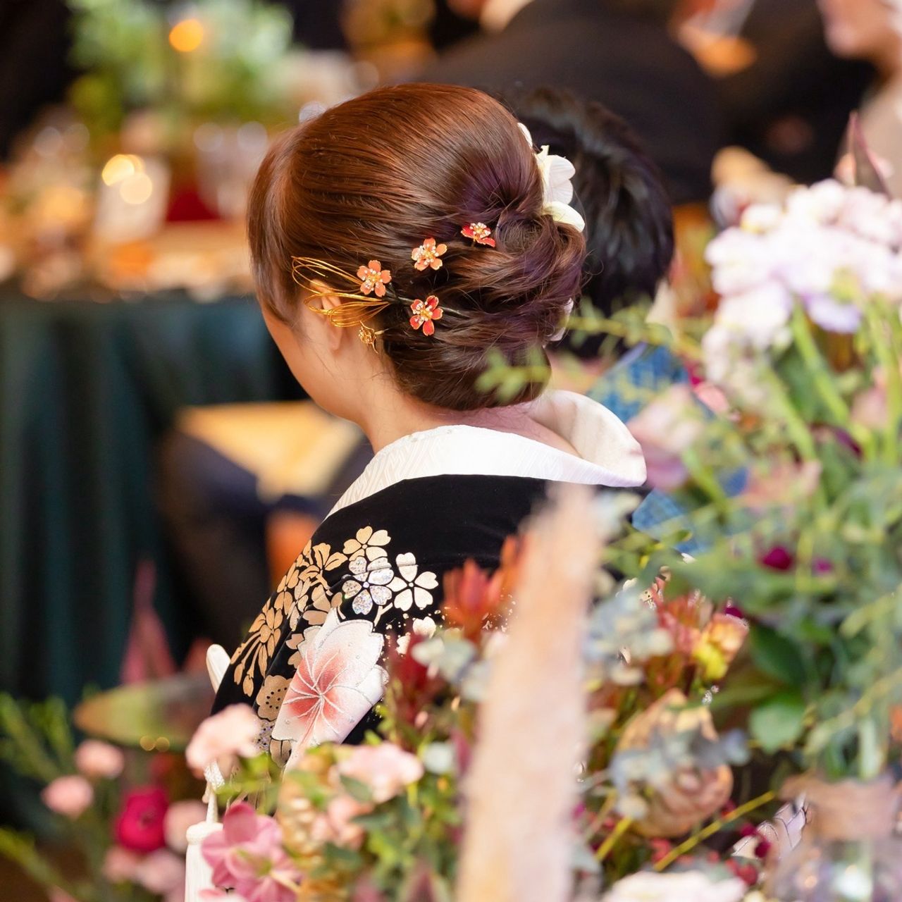 和装では、希望に合わせて水引をつけたヘアメイクにしてもらったことがこだわりポイントです。