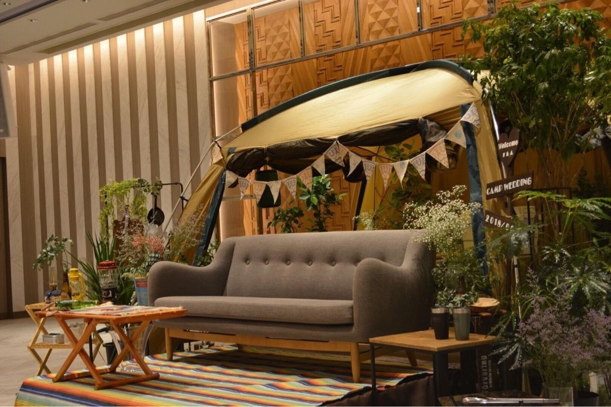 ゲストの方に、キャンプに来たかのような空間を感じてもらうために緑をたくさん飾ったりテントをメインテーブルに飾りました。今まで見たことのない演出にしたくてとことんキャンプらしさにこだわりました。