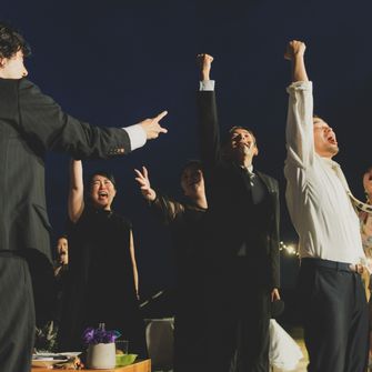 海外のガーデンウェディングの様なパーティー感覚で、少しカジュアルめに行いました。装花や装飾は少しシックなかっこいいテイストにしています。