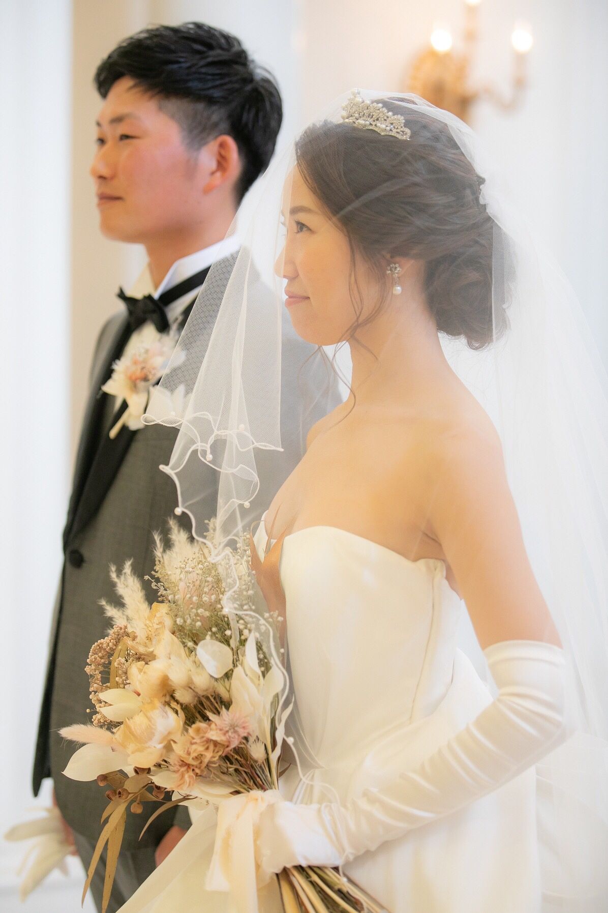 カラードレスでは編み下ろしでドライフラワーのヘッドパーツを付けました!メイクはリップを変えて目の下にラメを入れて再入場しました。