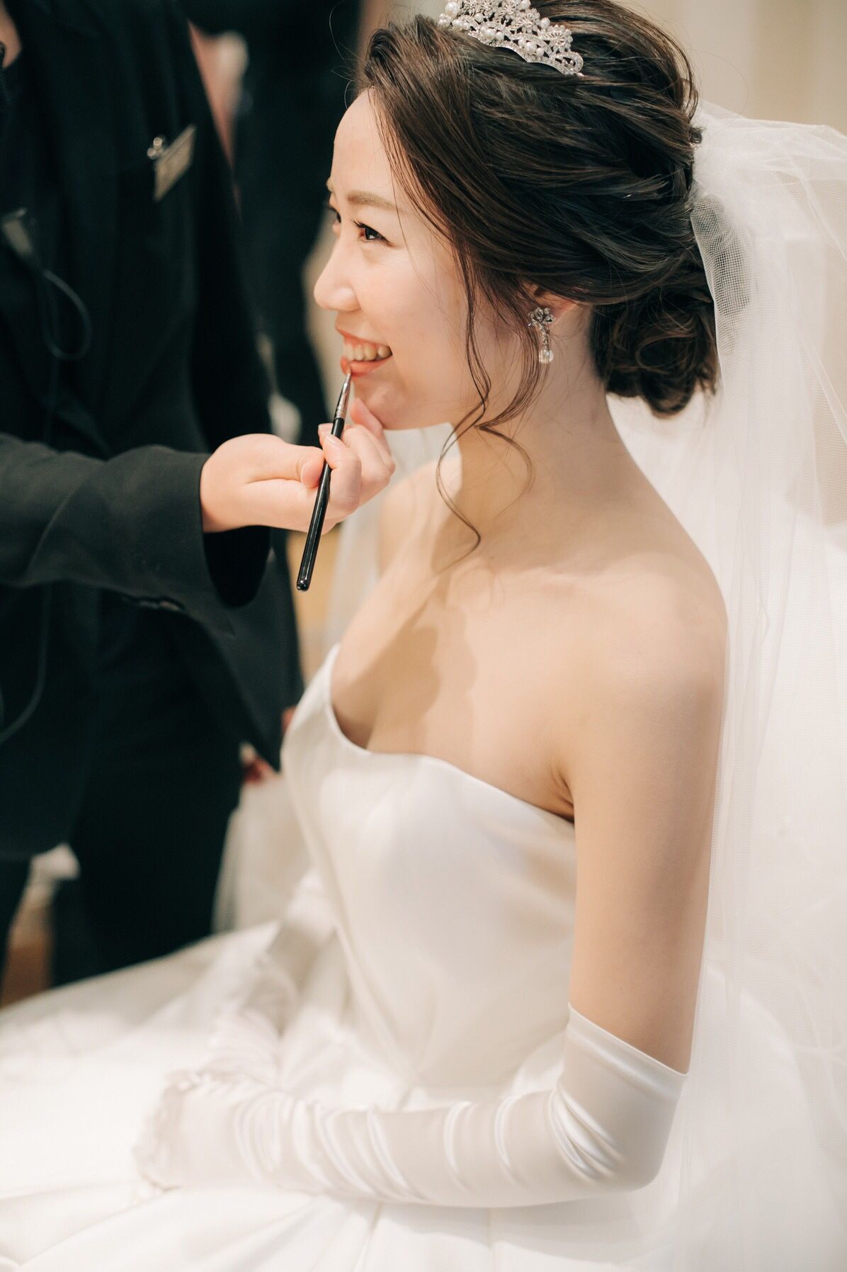 挙式ではシニヨンスタイル、ふわふわにしてもらいました。真っ赤のリップは苦手だったのでオレンジベースのリップにしました。
