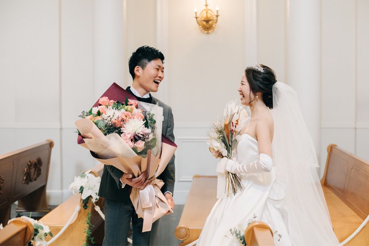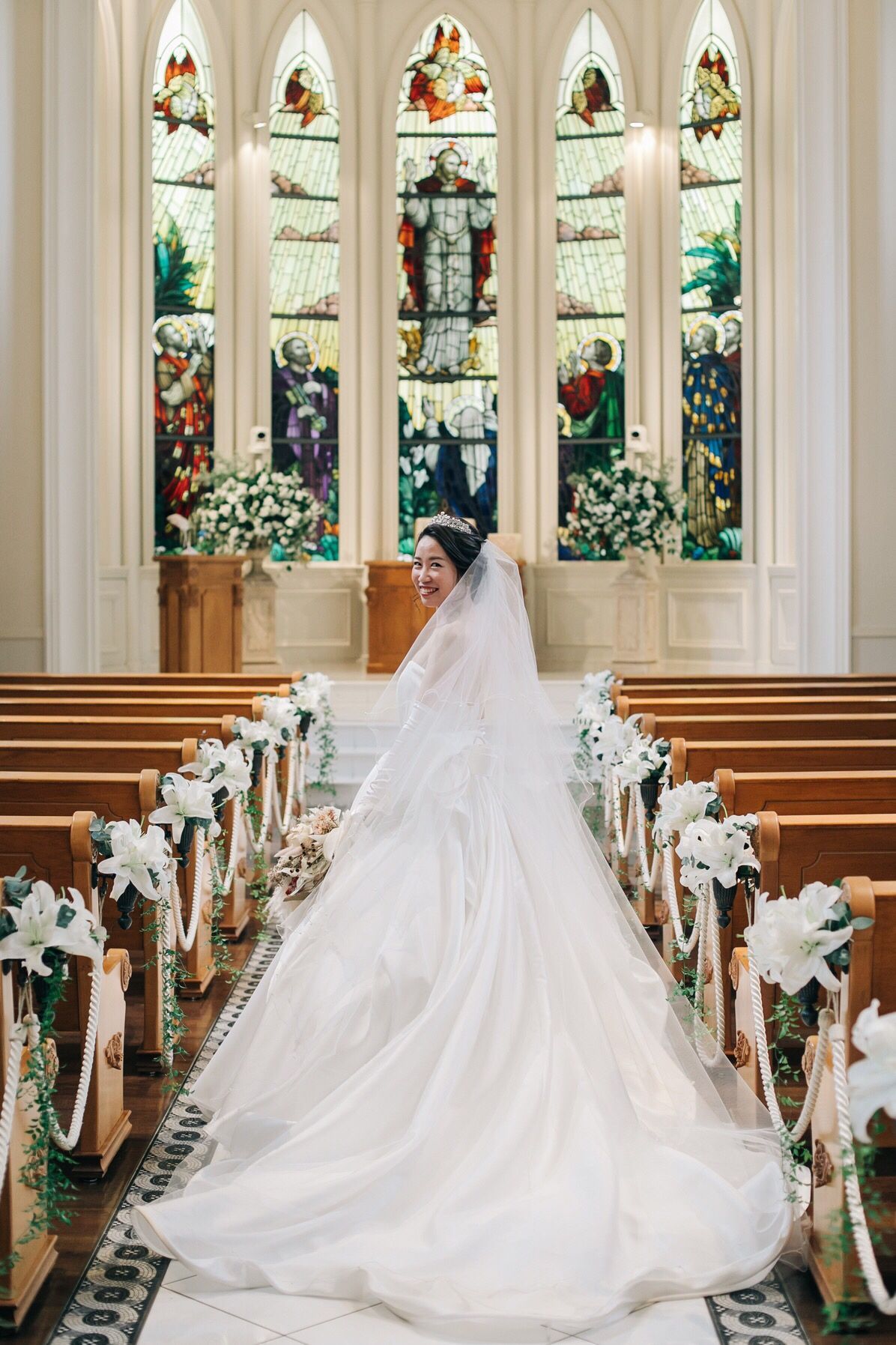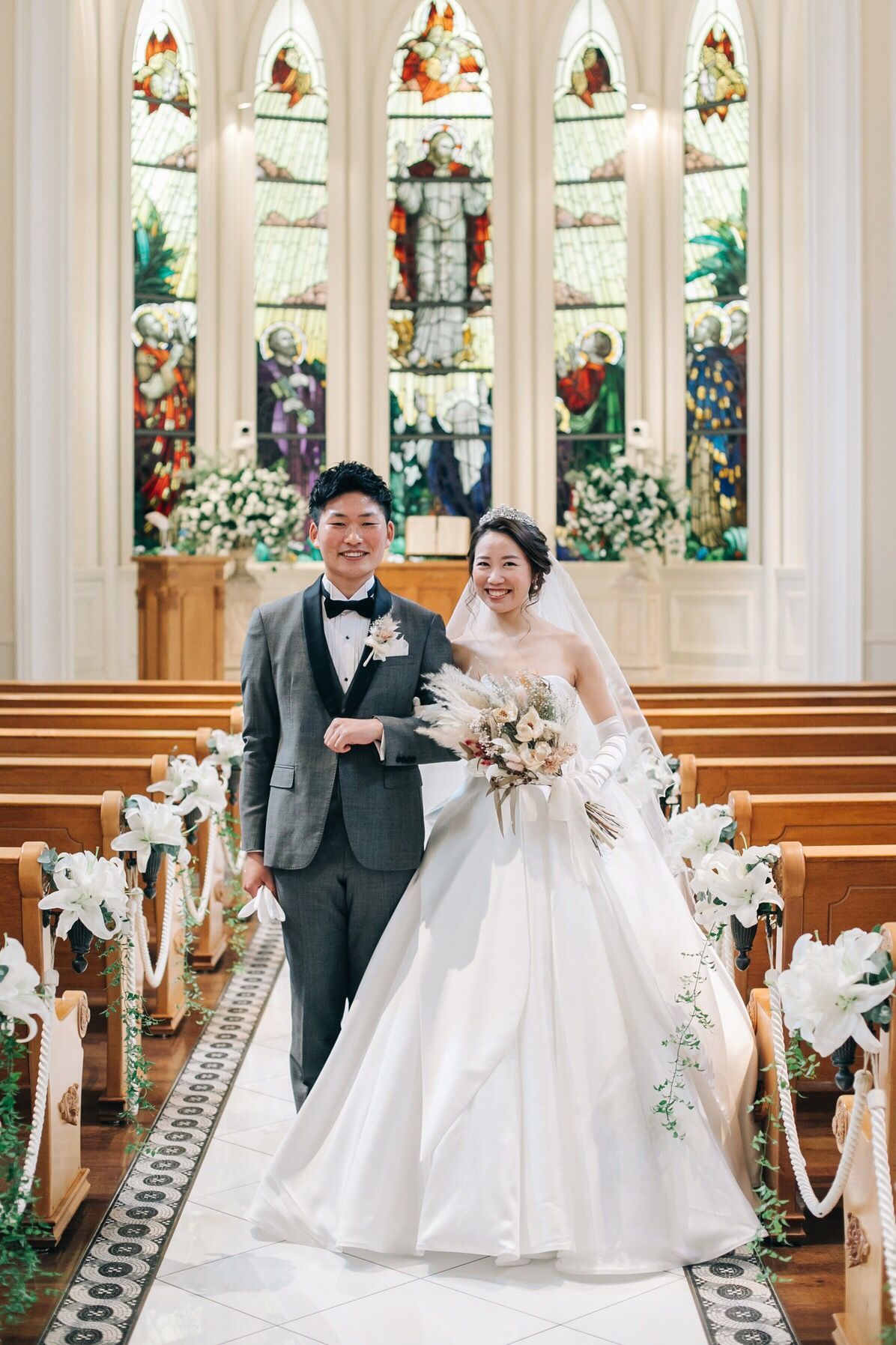 挙式会場は天井が高くステンドグラスがとても綺麗です。