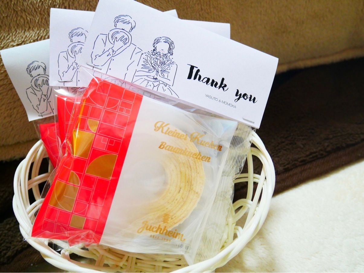 友達には引出物は宅配でカタログギフトや、タオル、ペアグラスを選んだ人、お菓子はチョコレートのバウムクーヘンにしました。