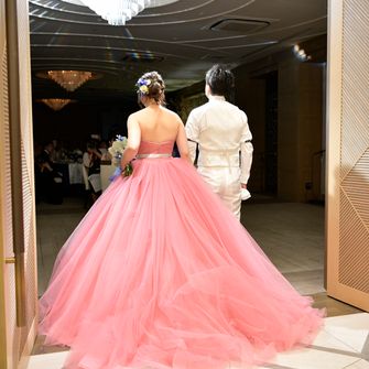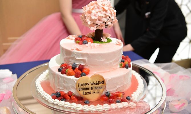 オリジナルのウェルカムドリンクやペーパーアイテム、披露宴のメインテーブルの後ろに桜を取り入れました。お色直しのカラードレスもピンクだったので、テーマにピッタリでした!