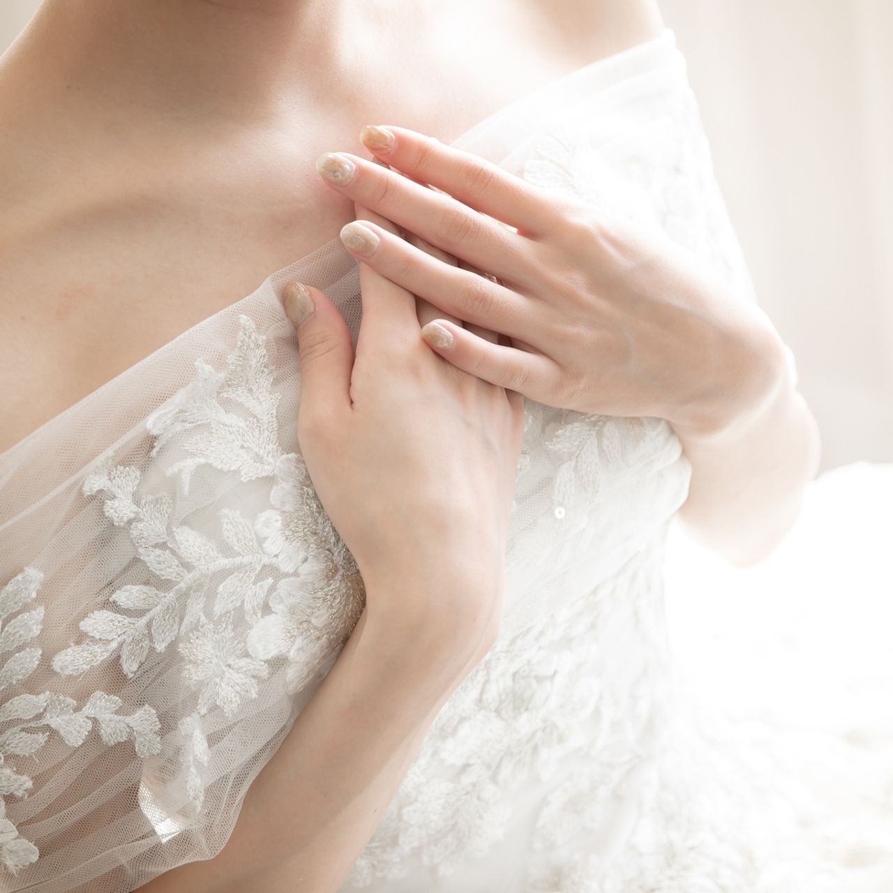 シャンパンゴールドの繊細な刺繍と、ホースカラーの裾がとても上品な一着です。