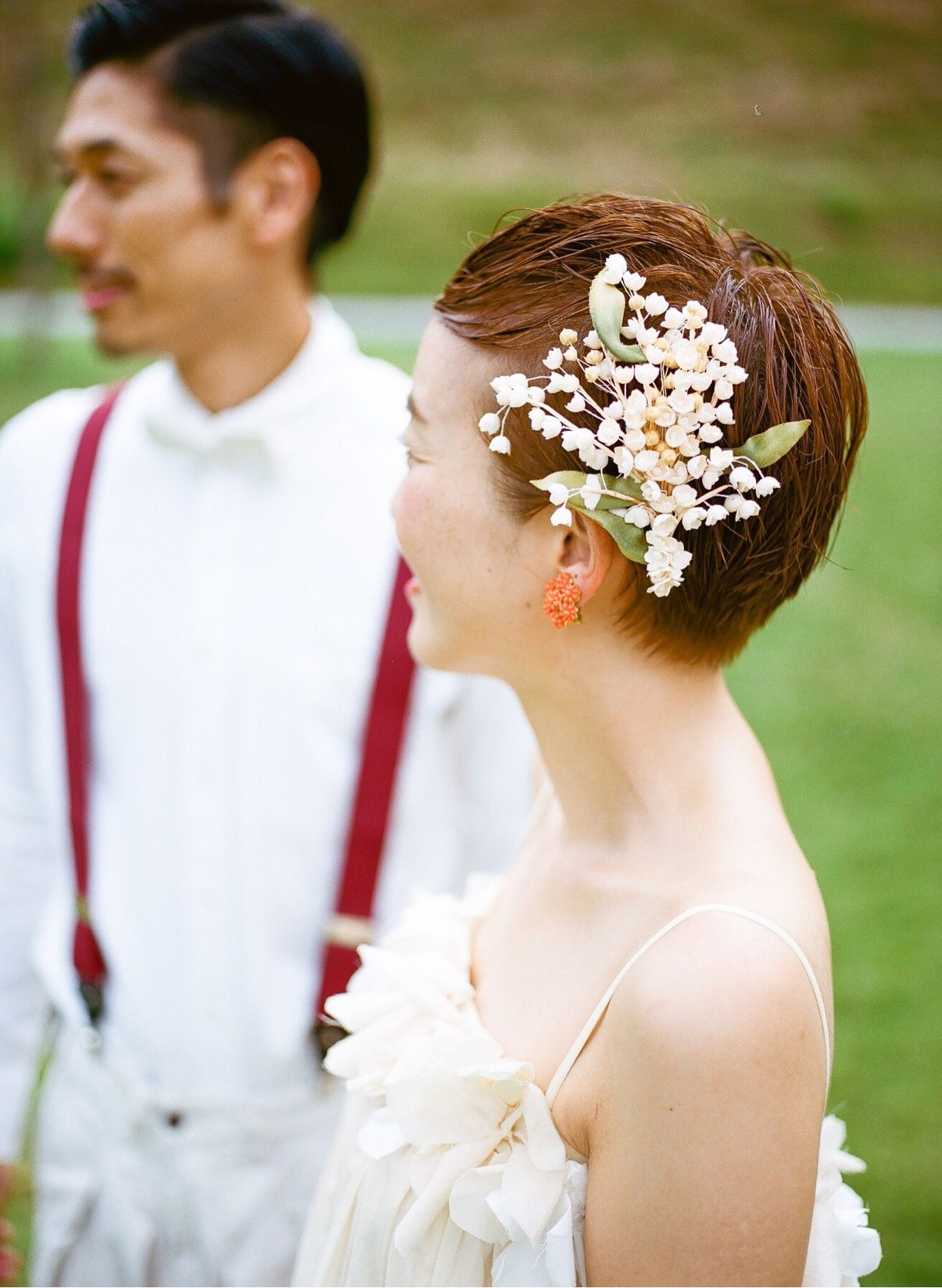 ベリーショートなので頭に大きめのアクセサリーをつけました。ドレスが生成なので、ヘッドアクセも生成を。すずらんモチーフのもので、動くと花も揺れます。