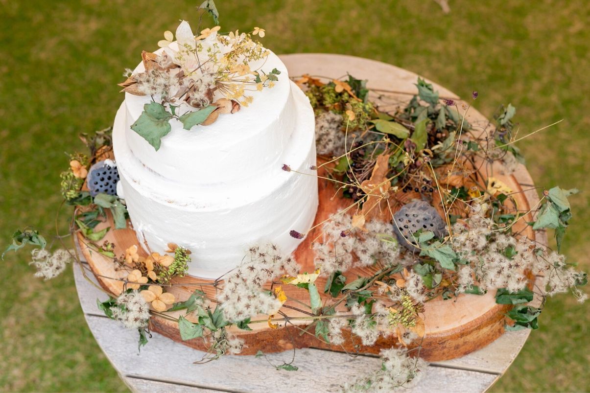 ケーキはシンプルなものにしてもらい、自分たちで手に入れた一枚板に置いてもらい周囲にドライフラワーを飾ってもらいました。
