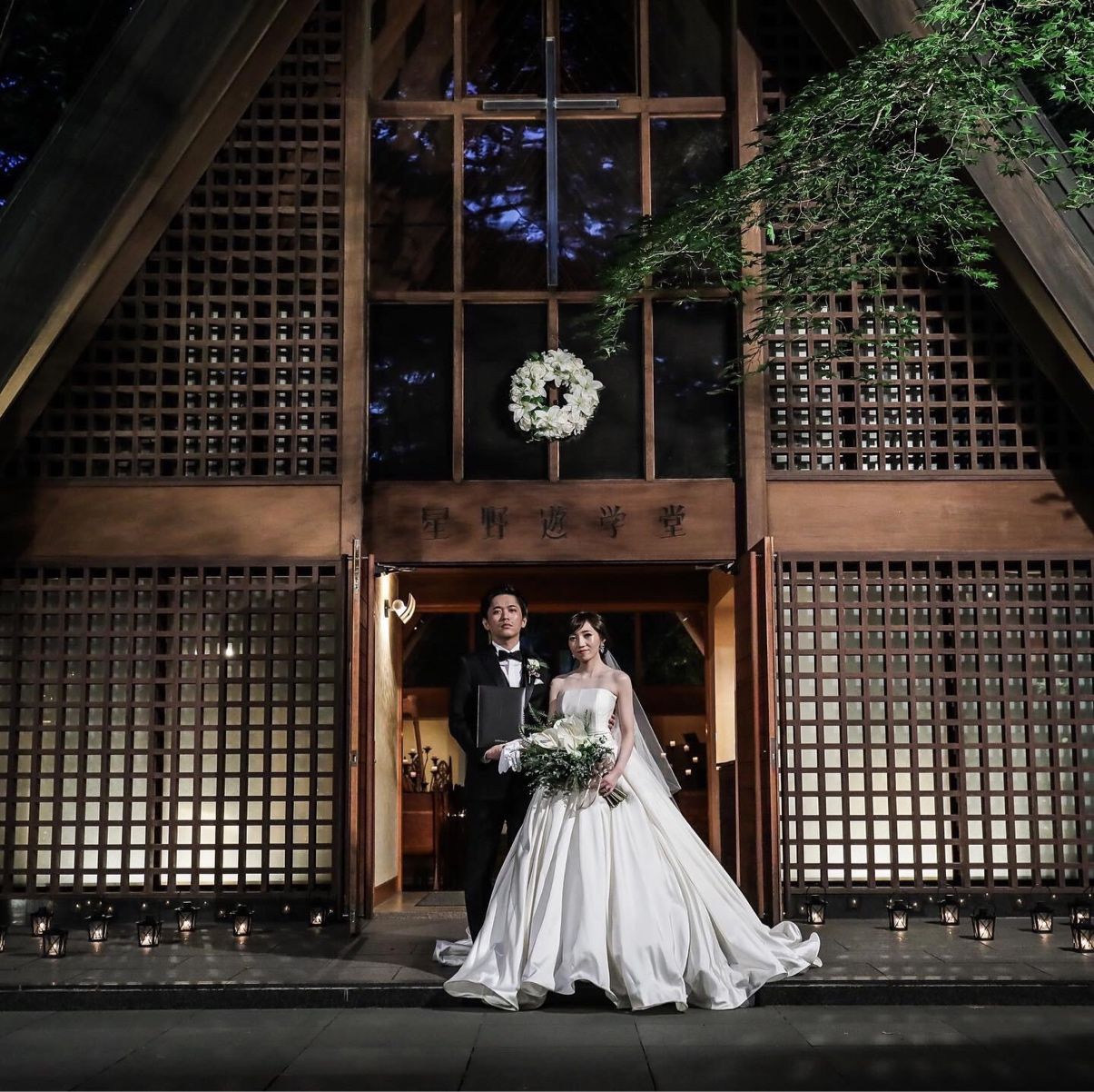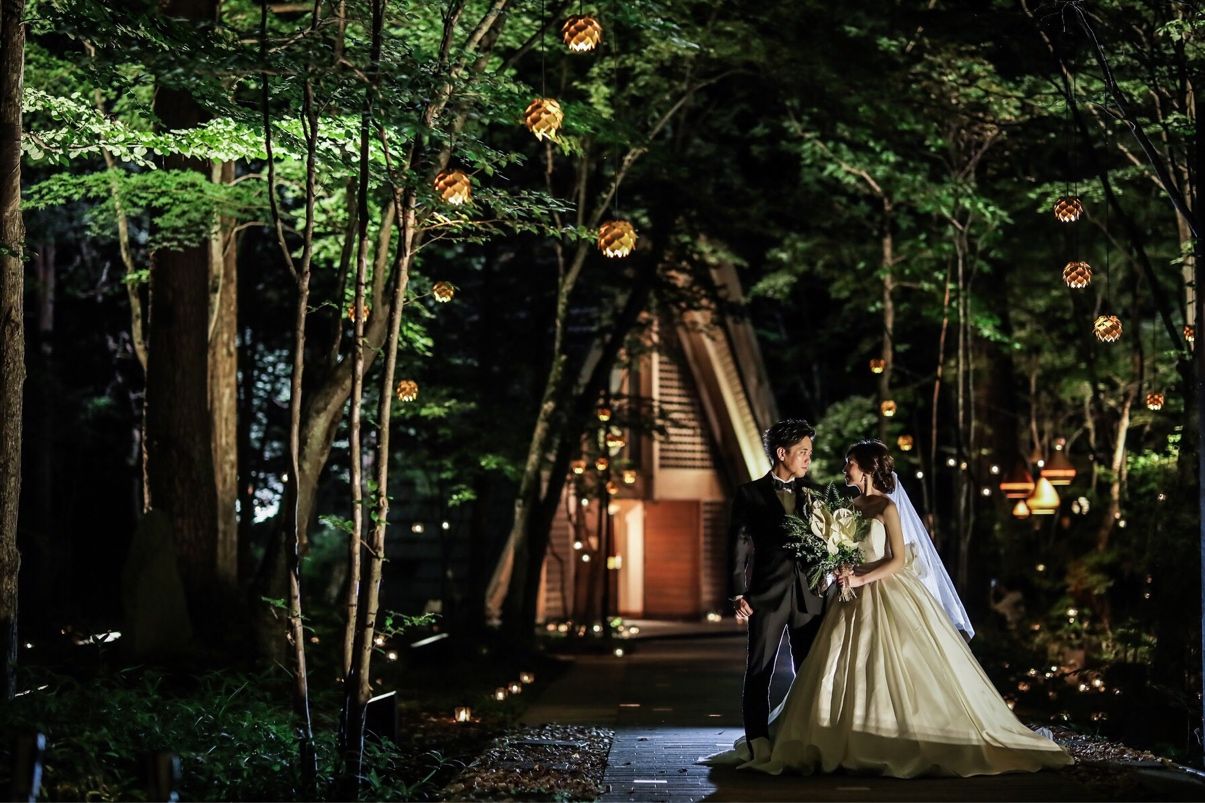 ただ、私たちは、緑の中でナチュラルな結婚式というよりは、なるべくシックで落ち着いた、洗練された大人婚をイメージしていました。そんな中で、高原教会のウェディングデスクへ相談に行った際、無数のキャンドルやランタンに囲まれた中での、ナイトウェデングの写真を見せていただいたとき、あまりの幻想的な空間に一目惚れしました。