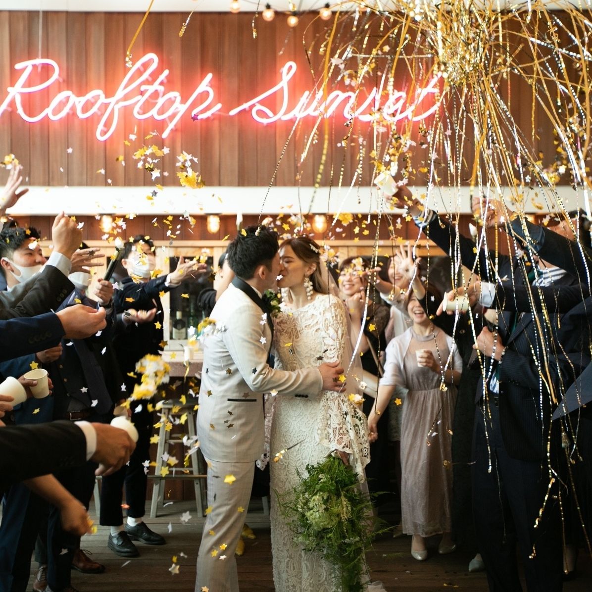 また、最上階にあるお洒落なルーフトップサンセットで「大切なゲストの方と写真を残したい!」という願いを叶えていただきました。ブーケトスもここで行い、最後に大好きな人たちに囲まれてキラッキラのクラッカーでお洒落な写真を残すことができて良かったです♡