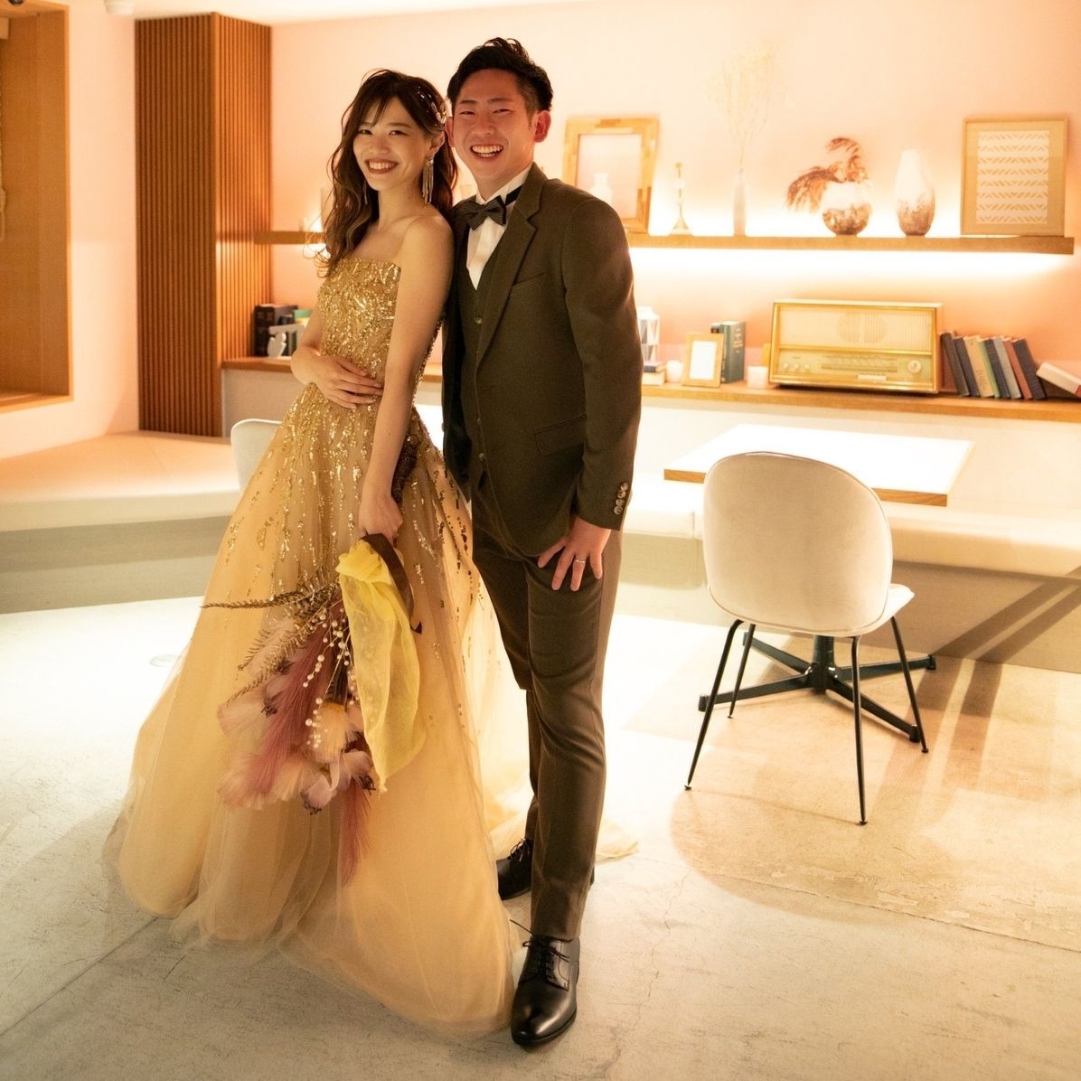 カラードレスは、THE TREAT DRESSINGのゴールドドレスです。ウェディングドレスとはガラッとイメージを変えて、キラキラでエレガントなものを選びました♡
