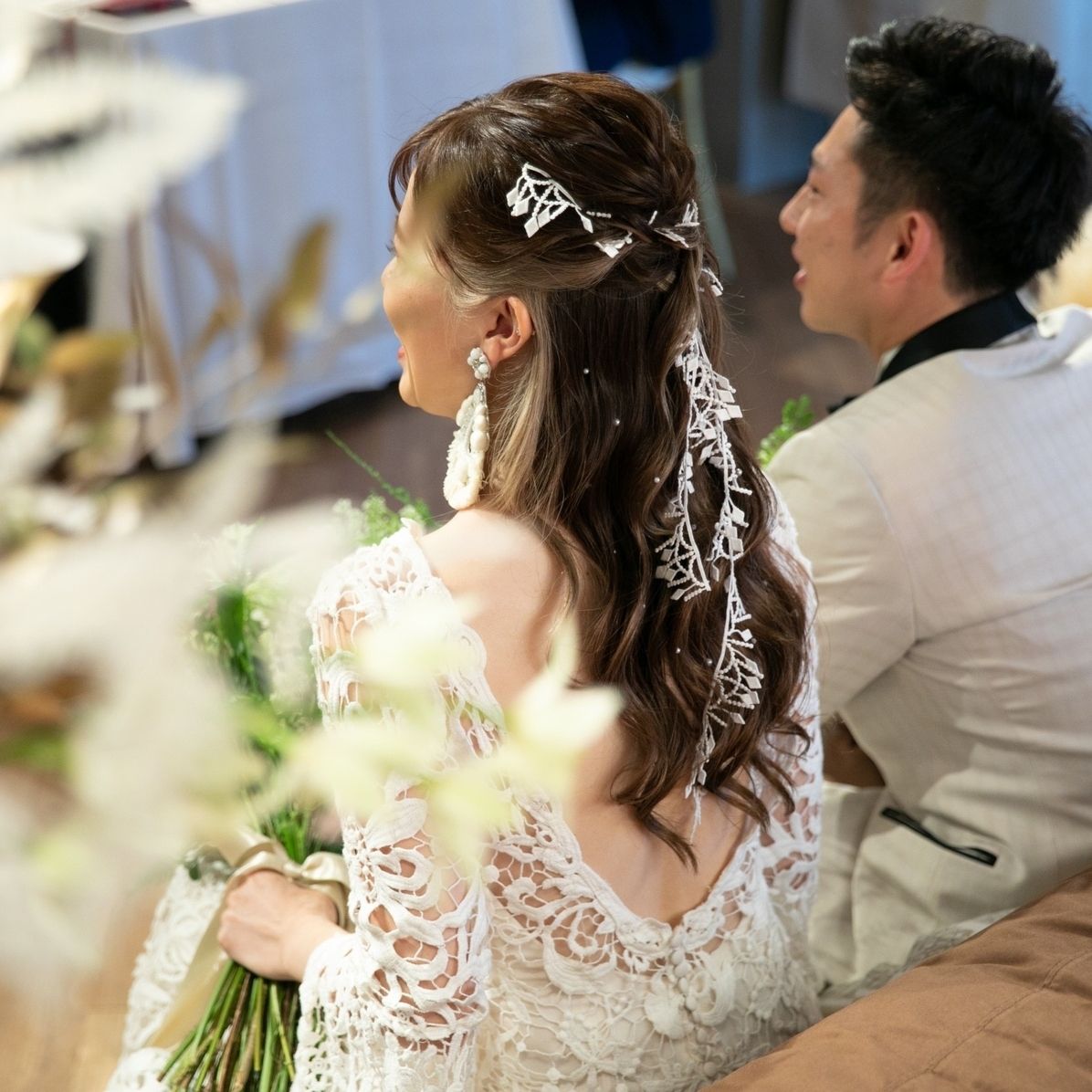 ウェディングドレスの時はドレスに合わせた大きめレースのリボンを、ハーフアップ部分に上手く編み込んでもらいました。レースのリボン以外にも、周りに小さなパールを散りばめたのがポイントです。