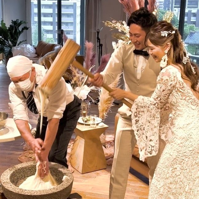 当日はゲストの皆さんの「ヨイショ〜!」の掛け声と共に、義父に手伝ってもらいながら夫と二人で餅をつきました。会場のあちこちから笑い声なども聞こえ、とても盛り上がったので「本当にやって良かったな」と思っています。“二人らしさ”が発揮できた時間でした!
