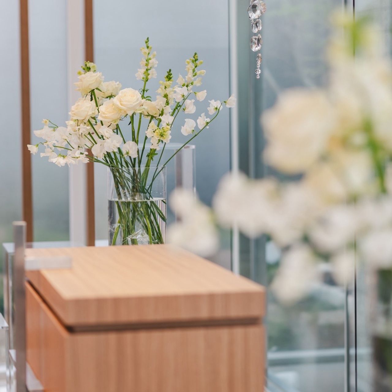 近年流行りの、余白を楽しむタイプの高さのある、ガラスの花瓶を用いたデザインは好みでは無かったので、流行ガン無視の余白ゼロでお願いしました。
