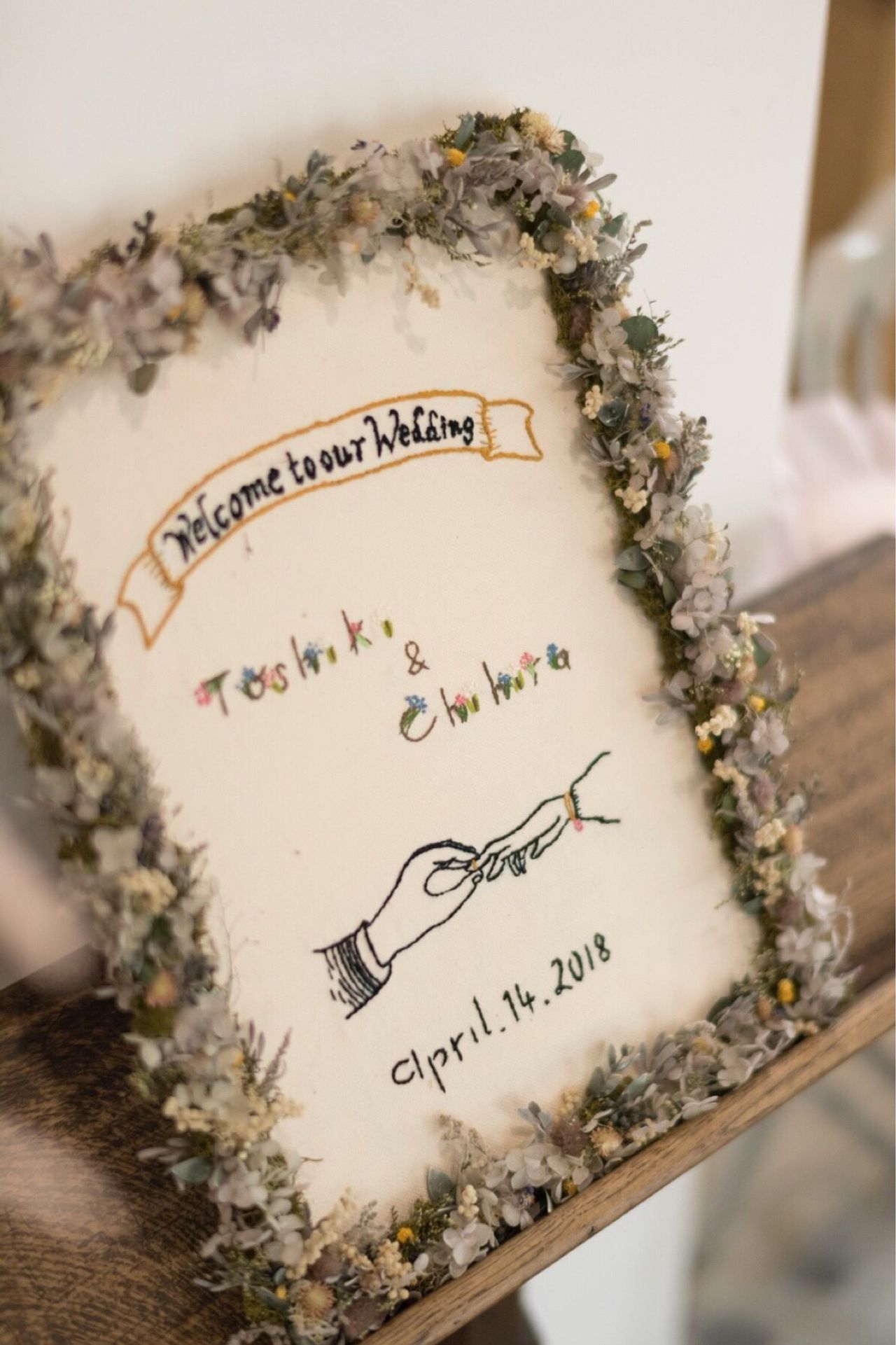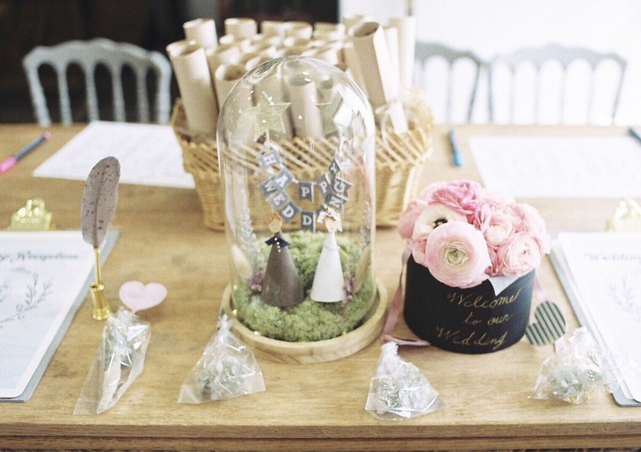 高砂のアーチを流木で組み立てる予定でしたが、諦めてタペストリーをデザインし、友人にコピーしてもらいました。タペストリーの上の部分の装花手作りです。 古書を置きたかったので、15冊ほどレンタルさせてもいました。 流木は友達のおじいちゃんに30個ほど用意してもらいました。 また趣味のカメラや 家にあったトランクや鳥かごを使ってもらいました。 フラワーシャワーでユーカリを使ったので、トイレにも飾ってもらいました。一人一人のテーブルに一本ずつユーカリと手作りのフワラーボックスを置いてもらいました。 受け付けの花は自分で用意しました。 退職のときに頂いたお花を流木につけてアレンジしました。