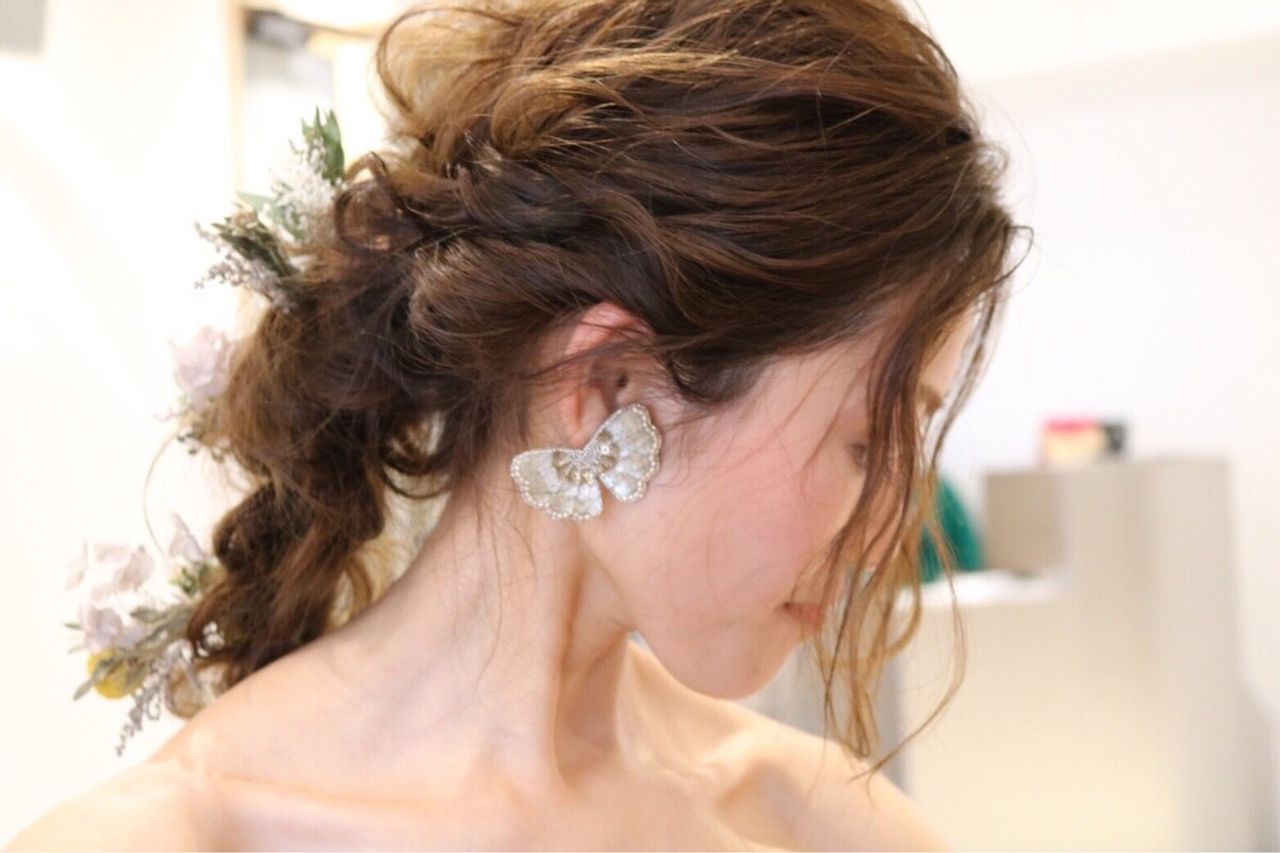 作家さんの手作りのイヤリング、花を付けたベール、ベッドアクセサリーは小ぶりのもの(イヤリング以外は手作り)