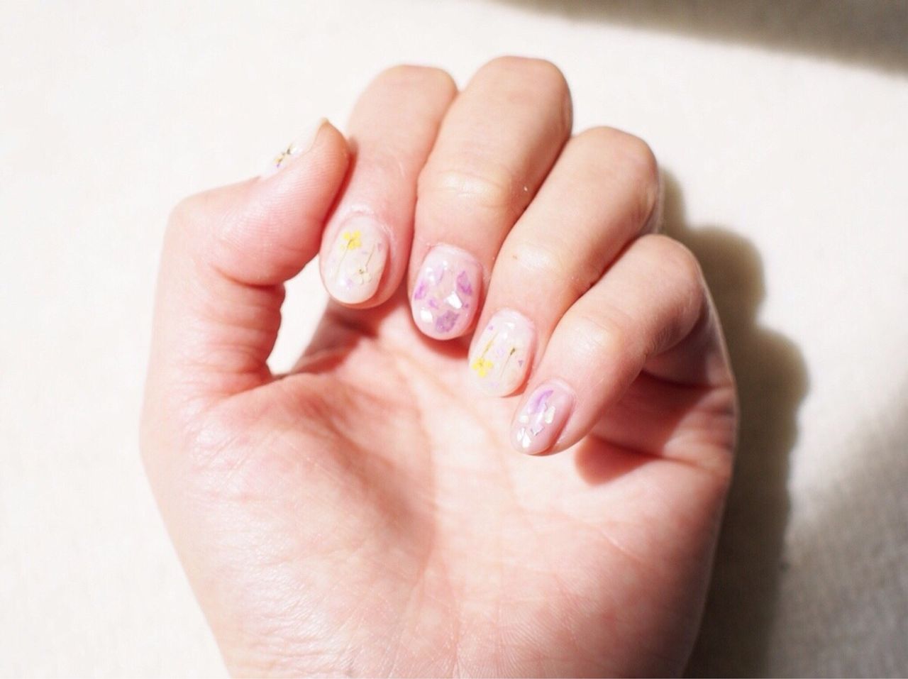 親指だけ新郎新婦のデザインで、あとの指輪は押し花とニュアンスネイル