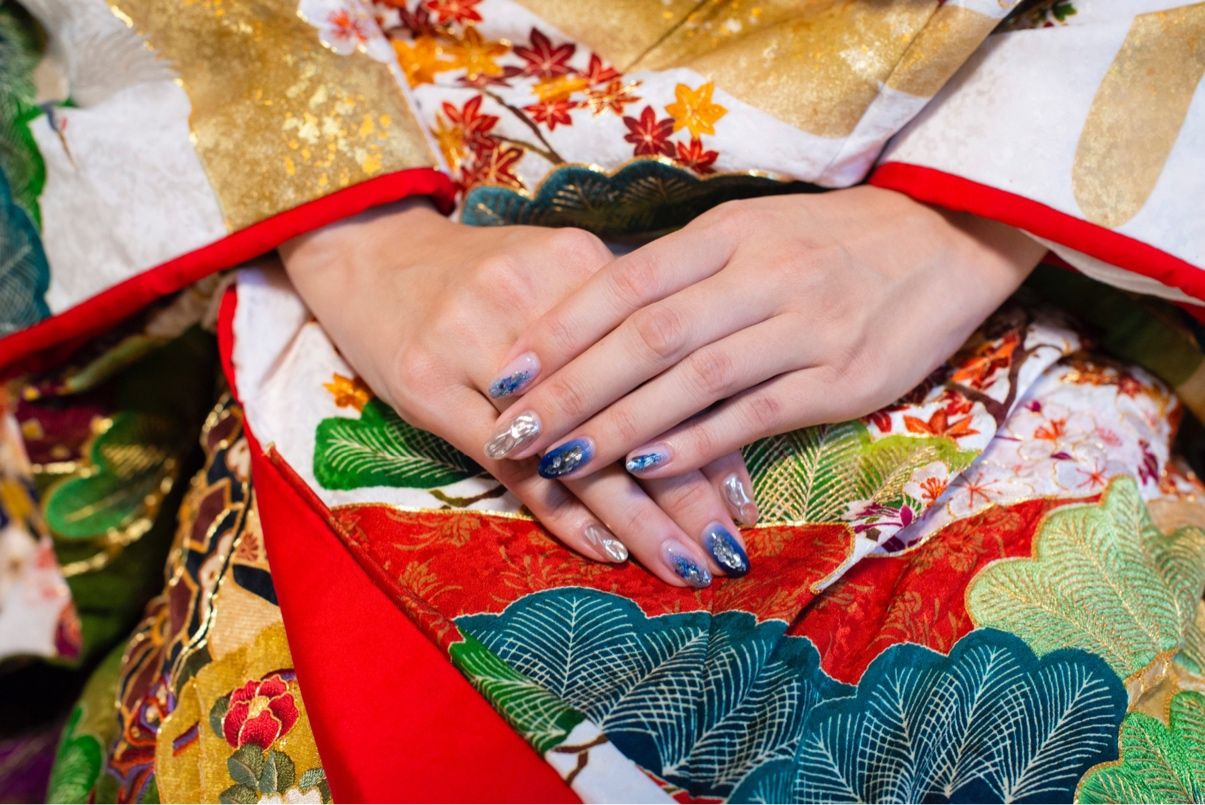 サムシングブルーと靴の色のシルバーも取り入れました。