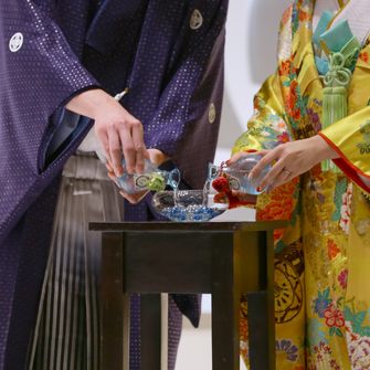 また、神・仏前式のように“三々九度”でお神酒を飲むような儀式をやってみたくもありましたが、この会場で取り入れるのは難しいとのことだったので、和風な演出として“水合わせの儀”を取り入れました。