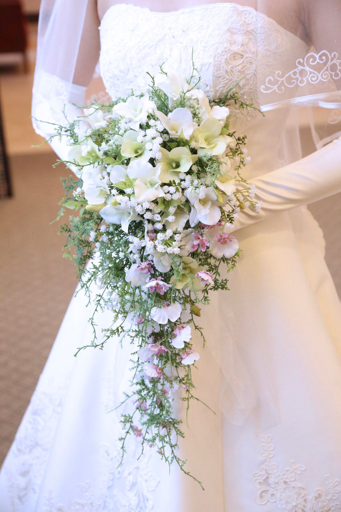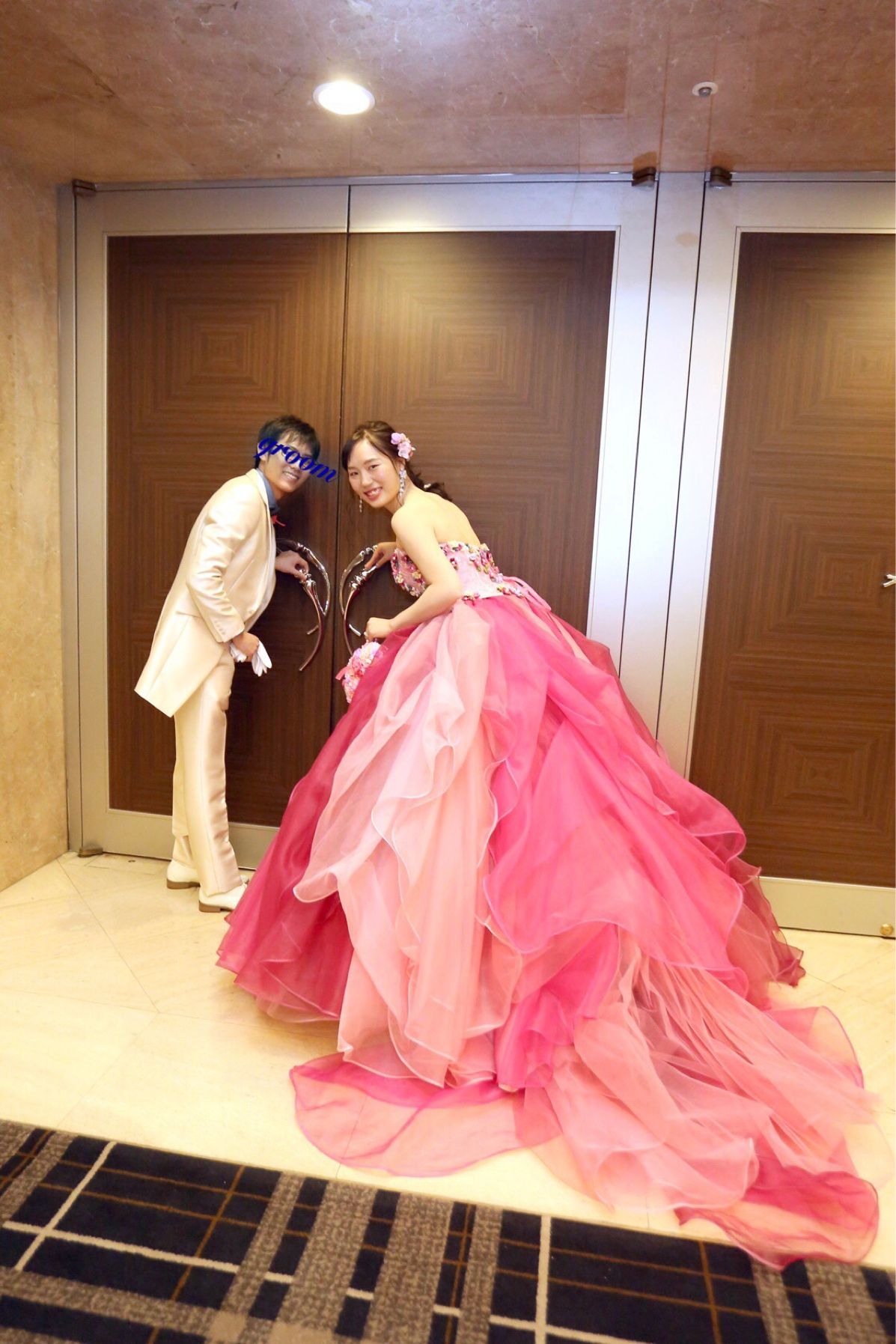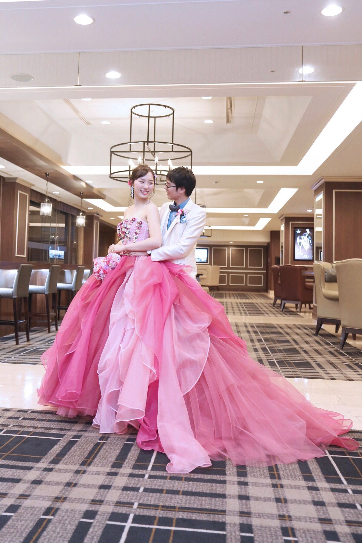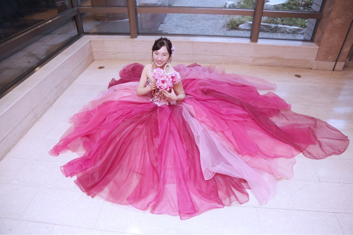 胸元のお花の装飾、グラデーションのチュールが印象的なドレスで、インスタグラムで見つけてから入荷を待って試着をしたドレスです。ピンクのチュールのドレスを着たいという希望を叶え、ボリュームのあるドレスで大好評でした。