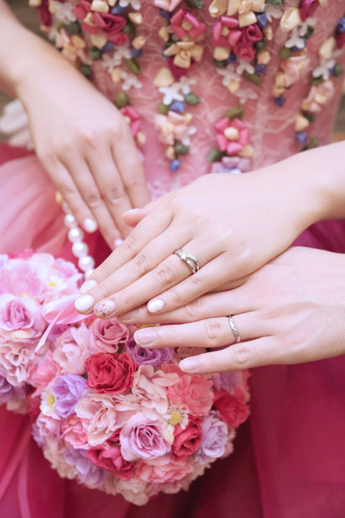 ウエディングドレス・カラードレスのどちらにも合うデザインをネイリストさんと相談して作りました。右手親指にはカラードレス時のブーケを、左手薬指にはカラードレスの胸もとを再現しました。左の小指にはパールで隠れミッキー作り、他の指は白基調でまとめました。