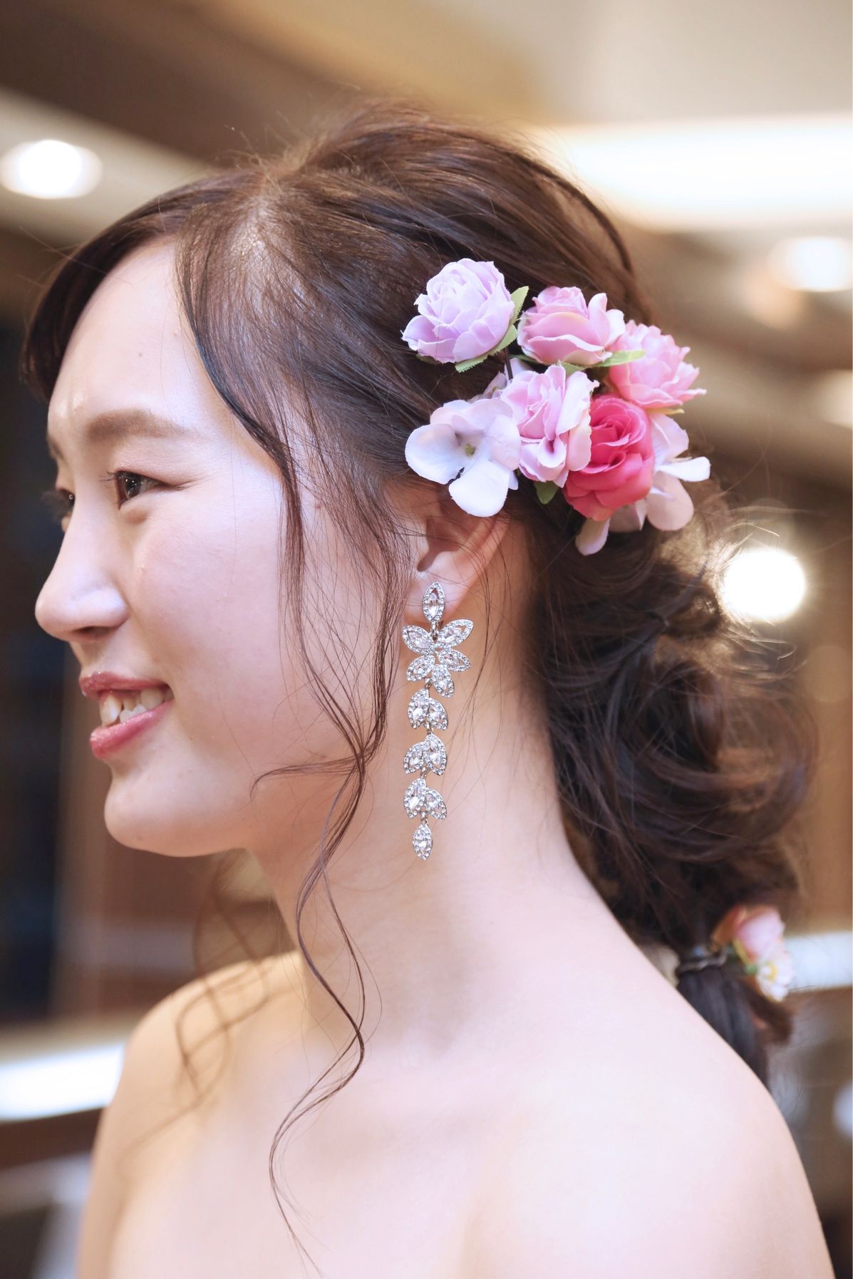 カラードレスのアクセサリーは、ドレスに合わせて作成したブーケと一緒に作成したお花の髪飾りで、編み下ろしに散らしてつけてもらいました。
