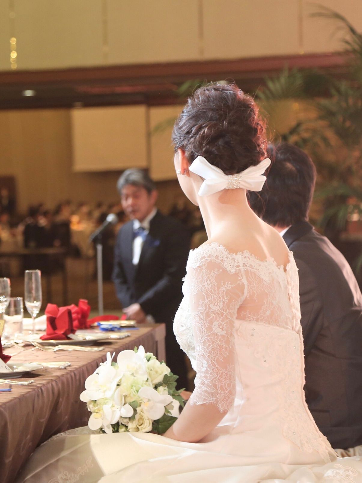 披露宴時のウエディングドレスのヘッドアクセサリーは、リボンボンネで、サテンのドレスと合わせて大人っぽい雰囲気に変更しました。