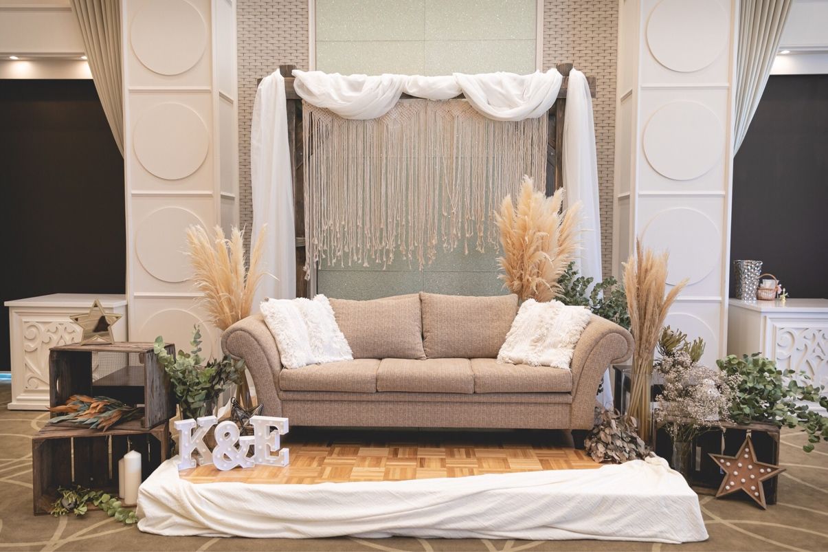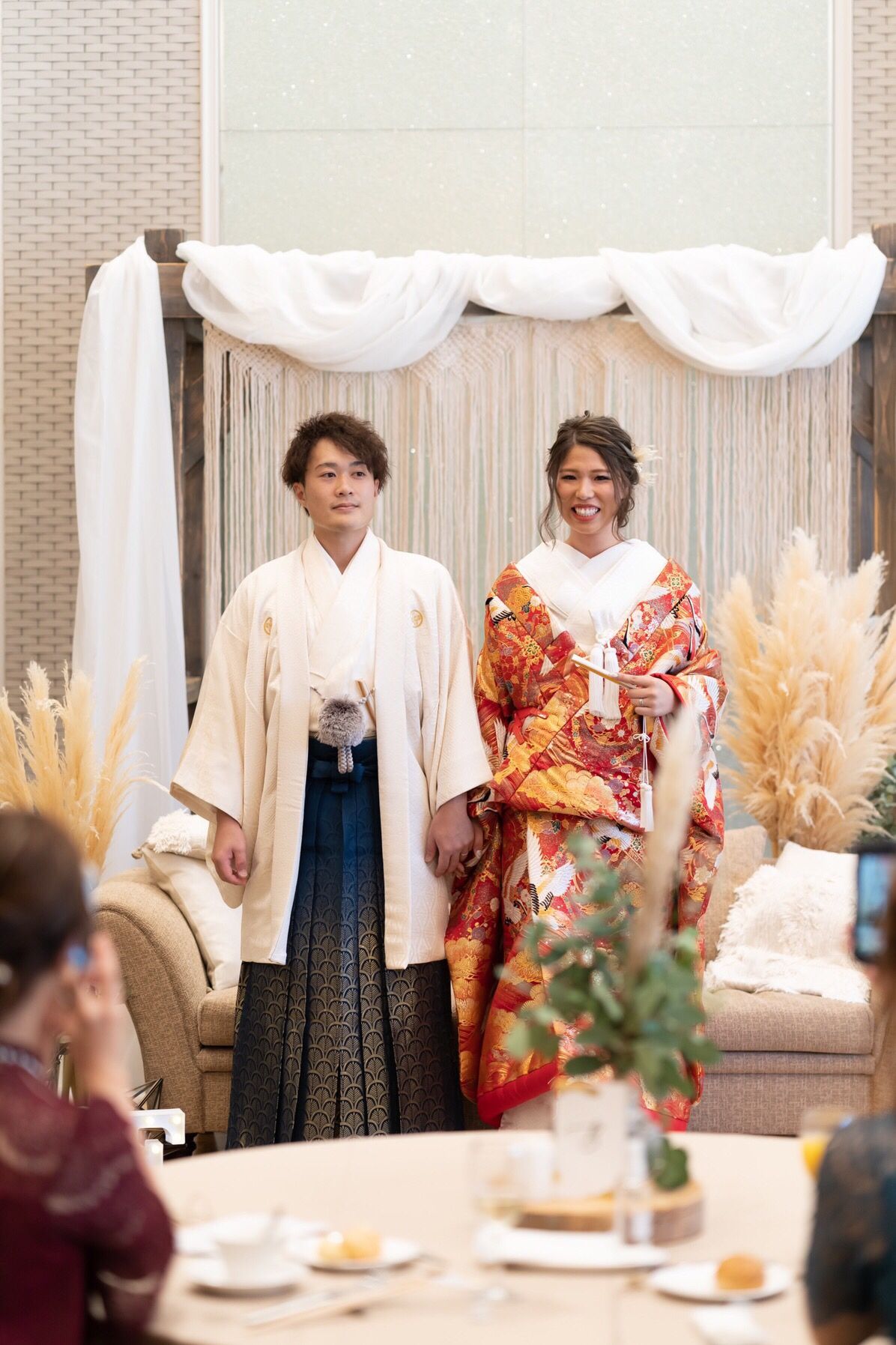 高砂は色味を合わせるために全てドライフラワーにしました。また後ろに木の枠組みに布とマクラメをつけ花と雰囲気と色合いを揃えました。