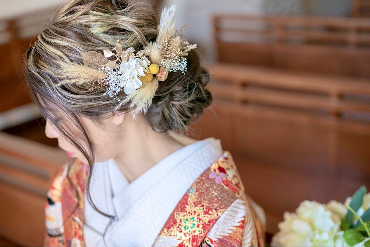 挙式では少し大きめのアクセサリーで、横から見て可愛いと思うように付けてもらいました。披露宴ではブーケと同じ種類のドライフラワーと和装に合うドライフラワーのアクセサリーを付けてもらいました。