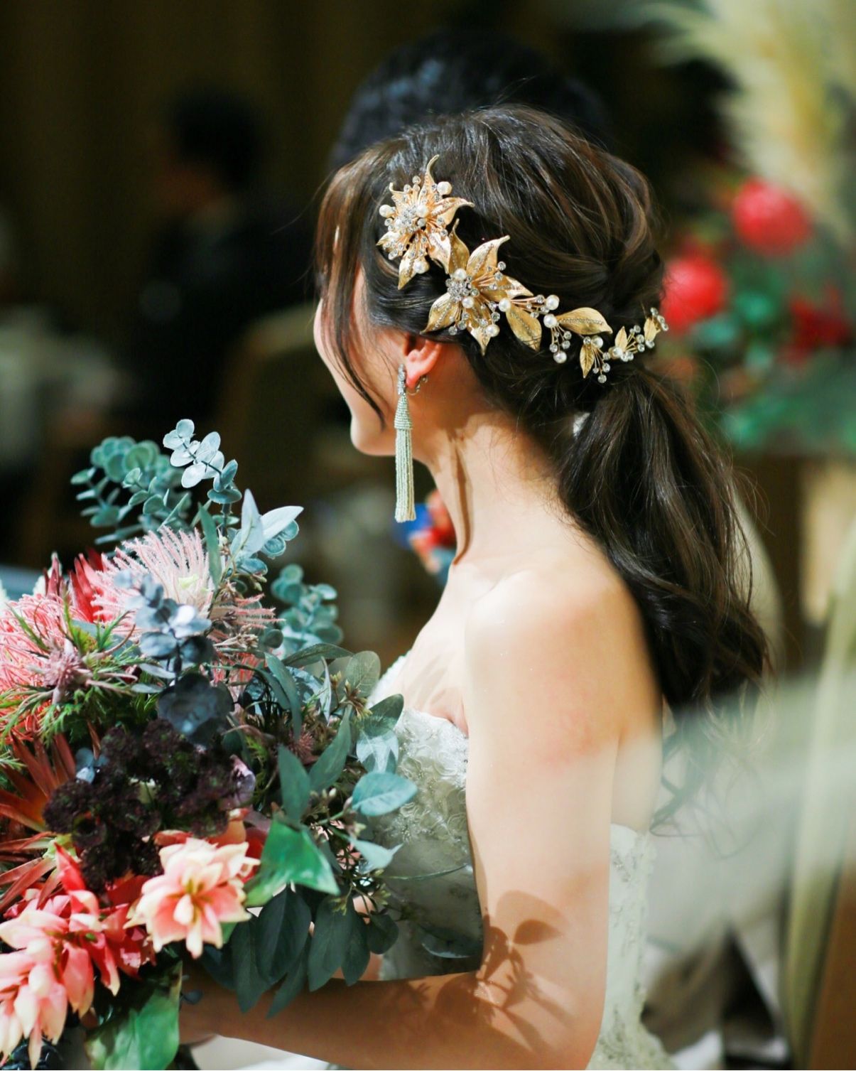 ベールをつける為ヘッドアクセサリーはなくてもよいかと着用を悩みましたが、少しでも華やかさを足すために、コスパの良いアクセサリー取り入れました。