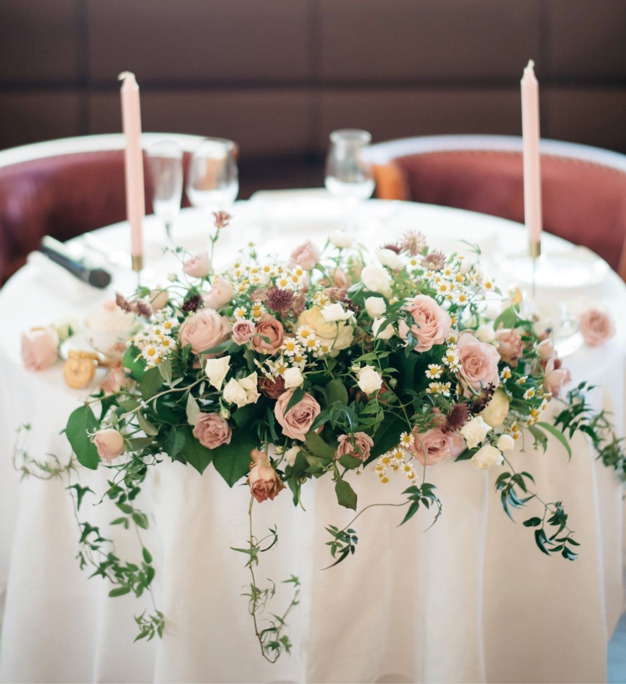 少しずつ違うピンク色のバラをメインに、マトリカリアをたっぷり使っていただき、可憐なイメージにしました。