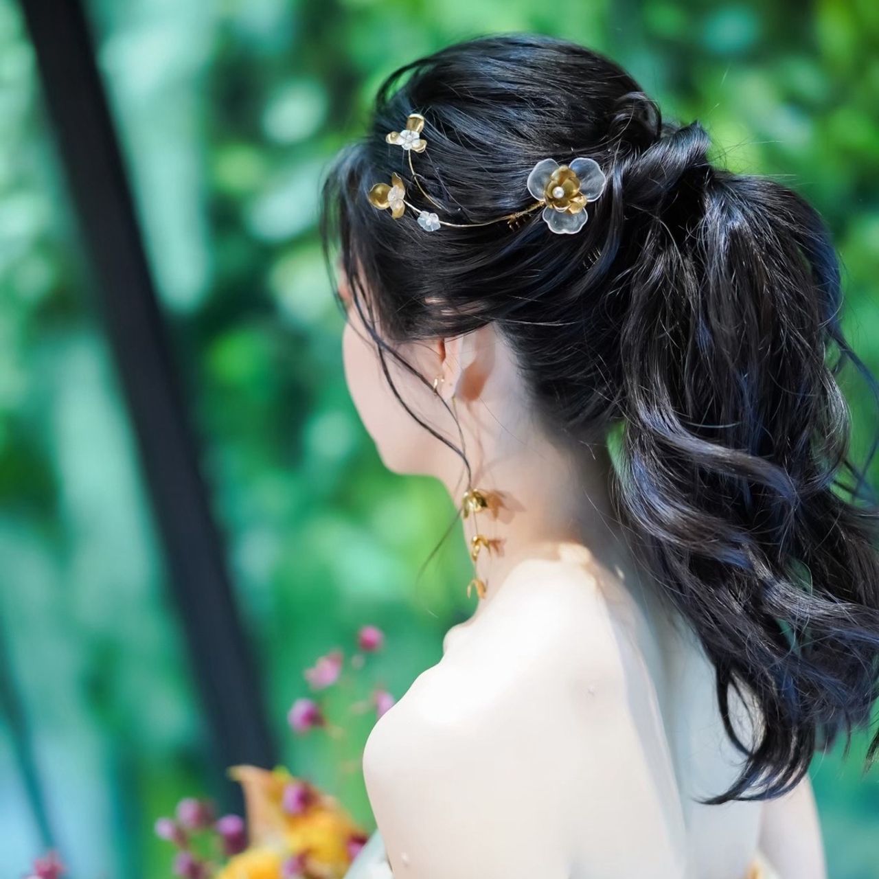 カラードレスではドレスに合わせた花がモチーフのゴールドのアクセサリーに変えています。
