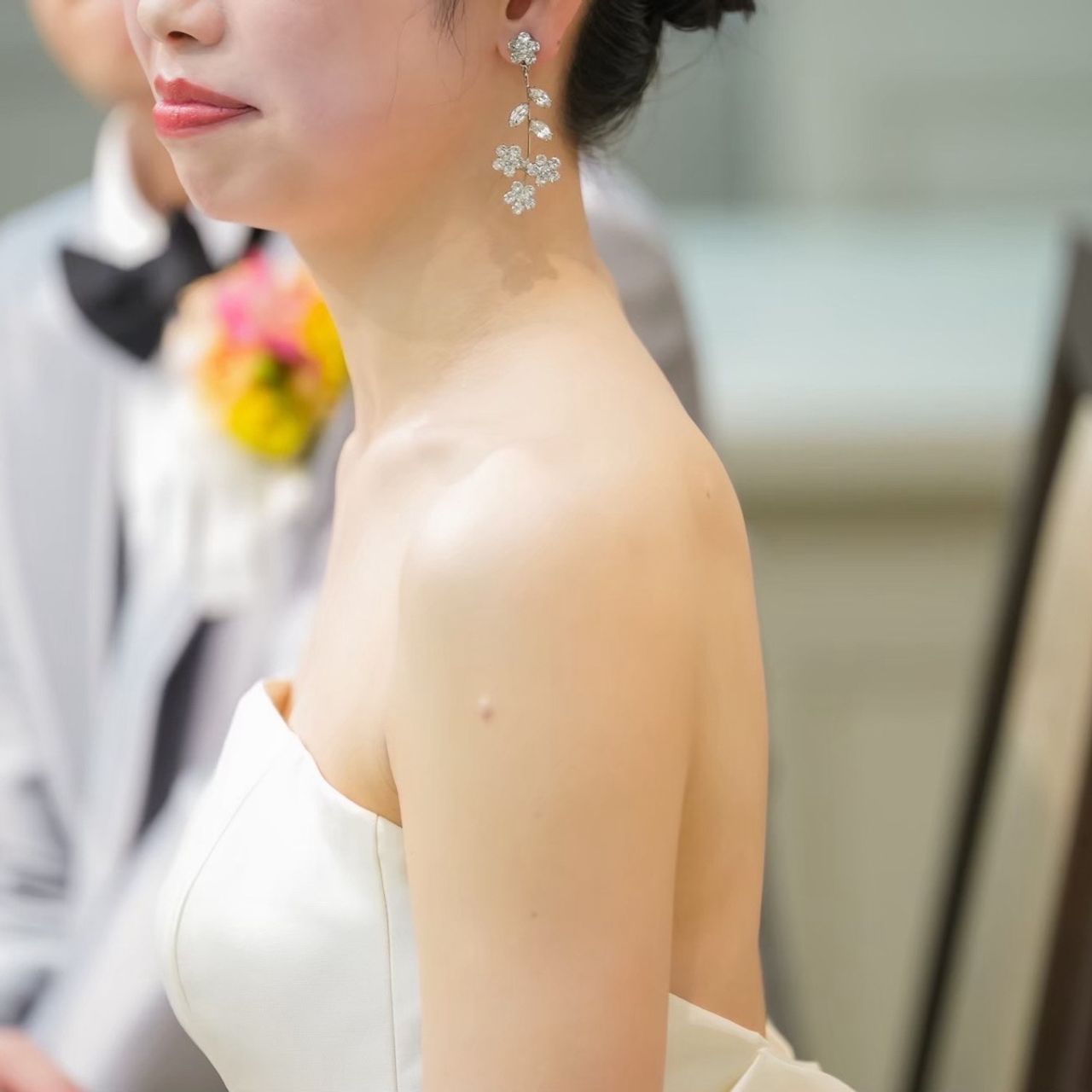 どちらのドレスもアップヘアだったので、ピアスは大ぶりなものを選んでいます。