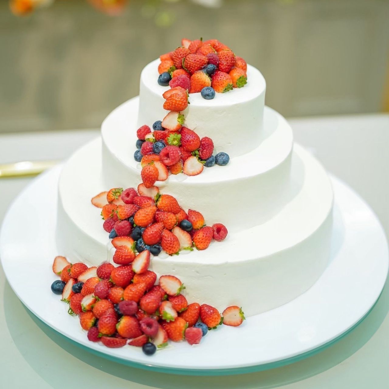 シンプルな3段のケーキにベリーが流れるようにかかっているものを選びました。