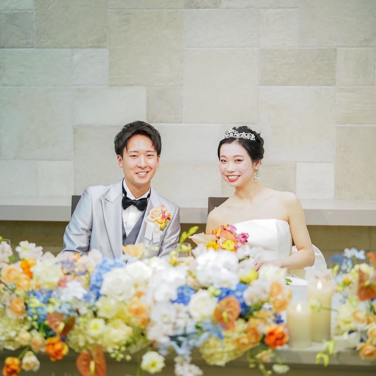 メインテーブルにはアイボリーをグリーンをベースに、差し色で淡い水色とオレンジのお花をあしらいました。