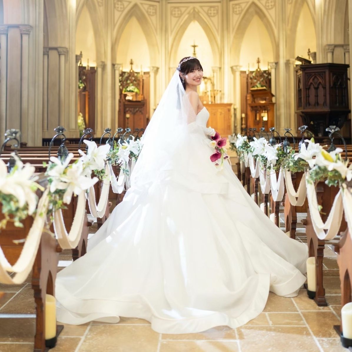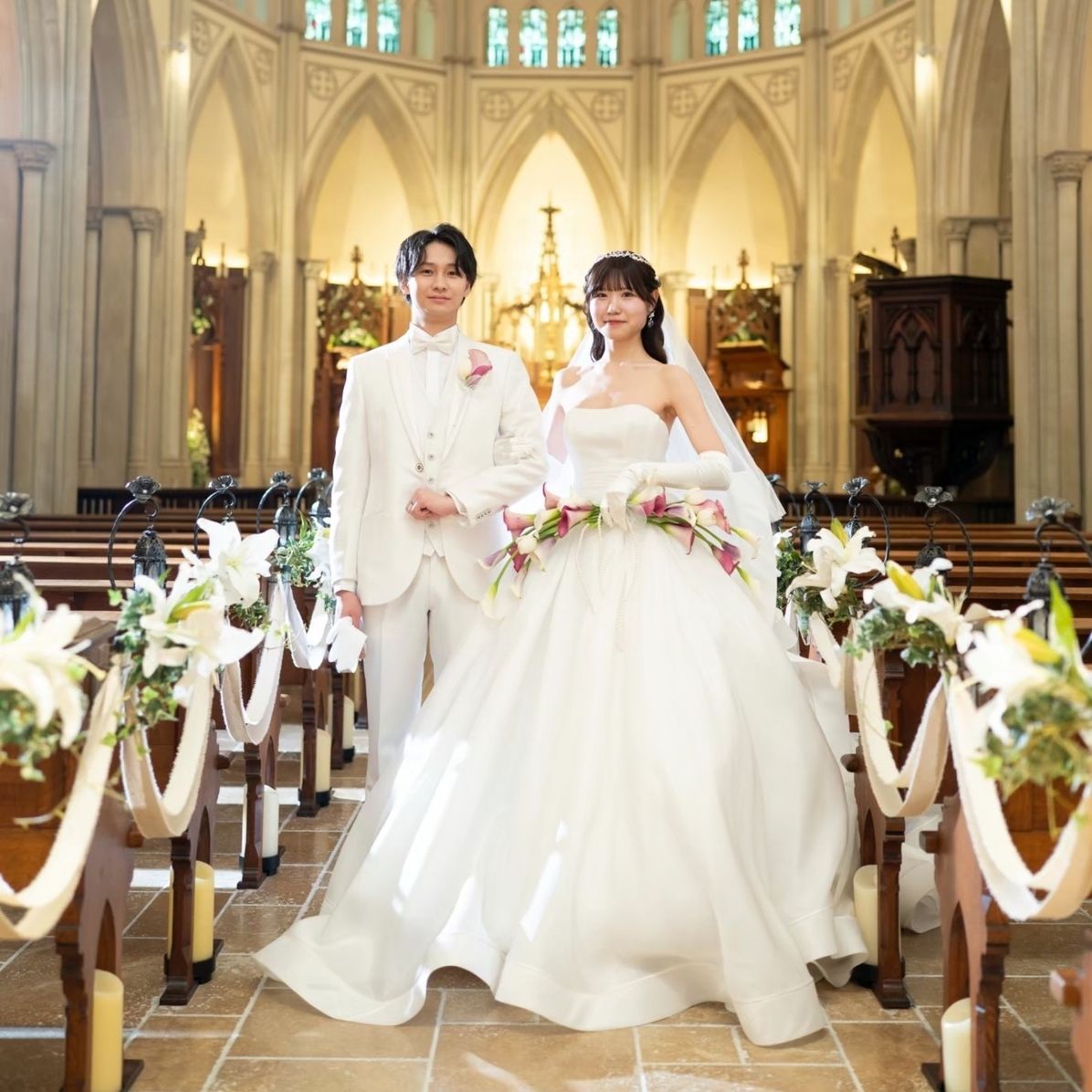 挙式会場は、ステンドグラスから差し込む光がとても綺麗で、当日は幻想的な空間に感動しました!さらに聖歌隊やパイプオルガンの音色が響き、特別感のある挙式になりました。