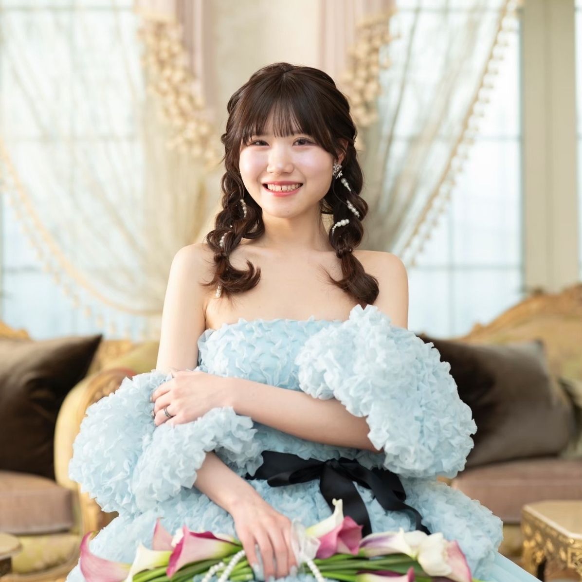 2着目は、ISAMU MORITAの通称プードルドレスを選びました。当時ちょうど新作として青色が登場したタイミングで、一目見た瞬間に惹かれてすぐに予約しました。ふわっと触りたくなる見た目でとても可愛らしく、着たときの愛くるしさがたまらない一着です。会場の雰囲気にもぴったりで、お色直しにぴったりのドレスでした!